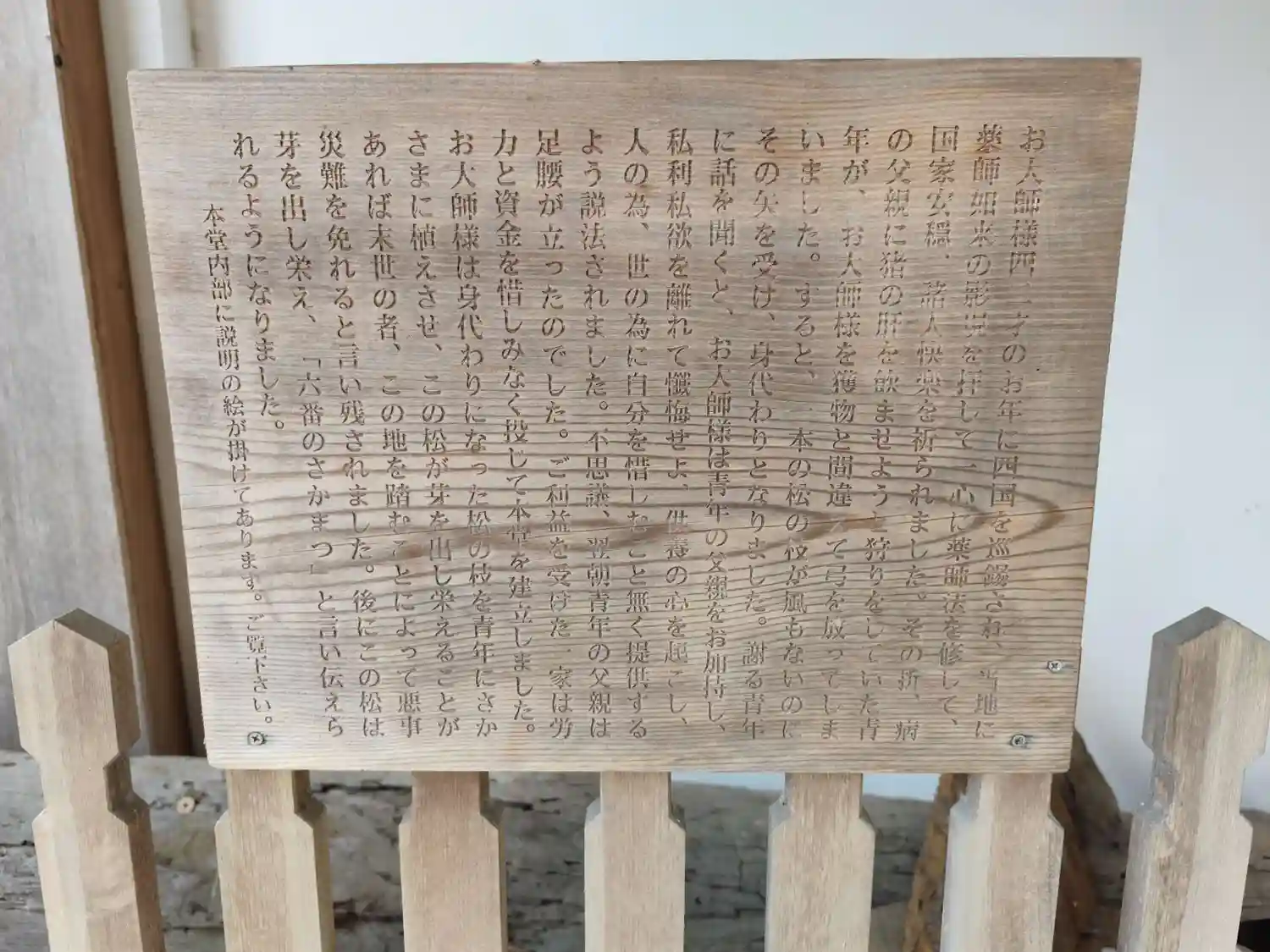 猟師が誤って修行中の弘法大師に矢を射った。その時、松の枝がなびき、弘法大師を救ったと言われる松。その松を、大師自らがさかさまに植えたとされる。(四国霊場開創1200年記念絵はがき)