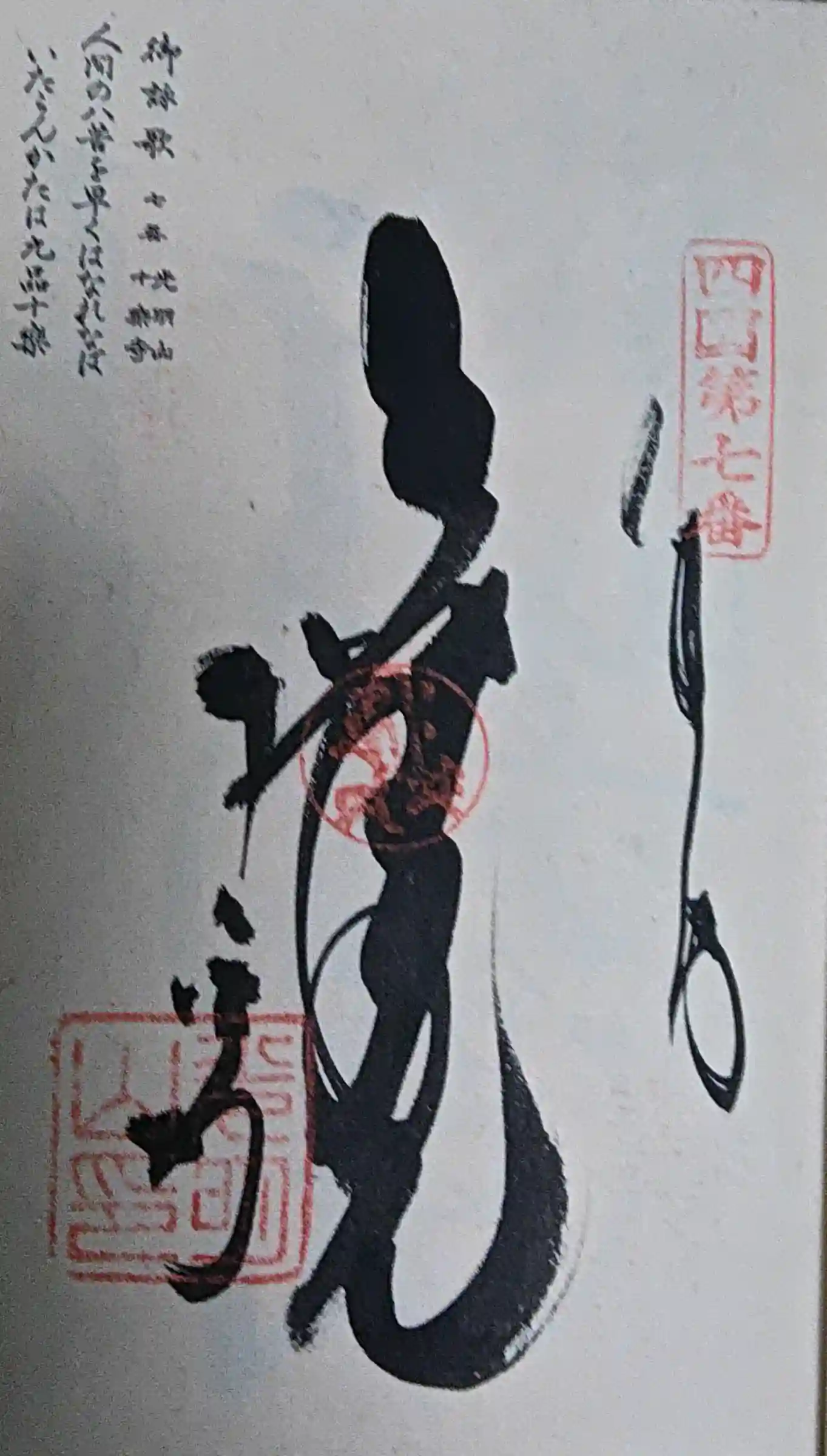 真ん中に無量寿、左下に十楽寺と書かれ、右上に四国第七番の印、真ん中に梵字の印、左下に光明山印が押されています。 | |||