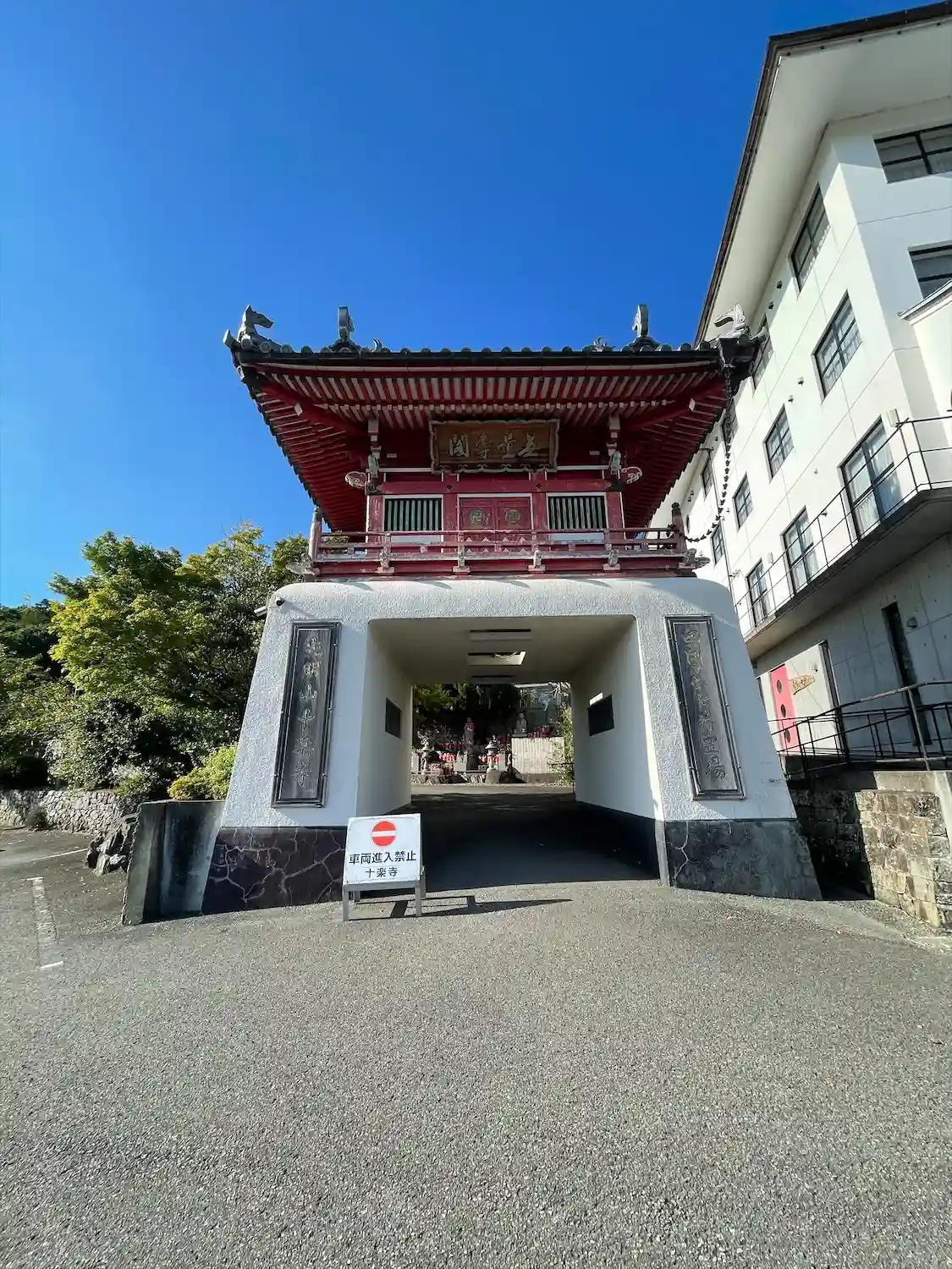 中華風の鐘楼門で朱塗り、漆喰できれいです