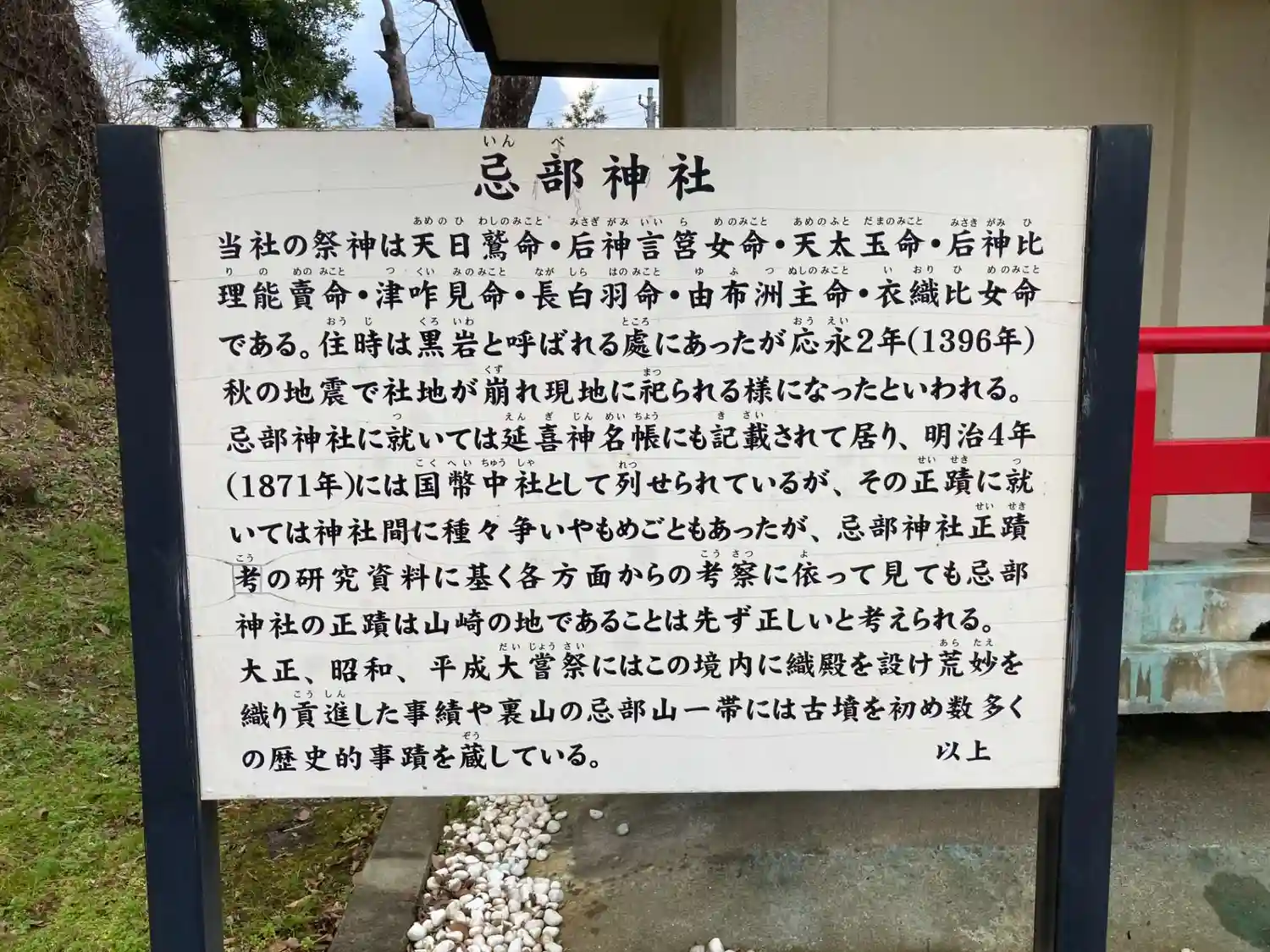 忌部神社正蹟と書かれています。忌部神社の所在が分からなくなって、当社がその論社に最初に挙がって太政官布告によって国幣小社になったこともありました。
