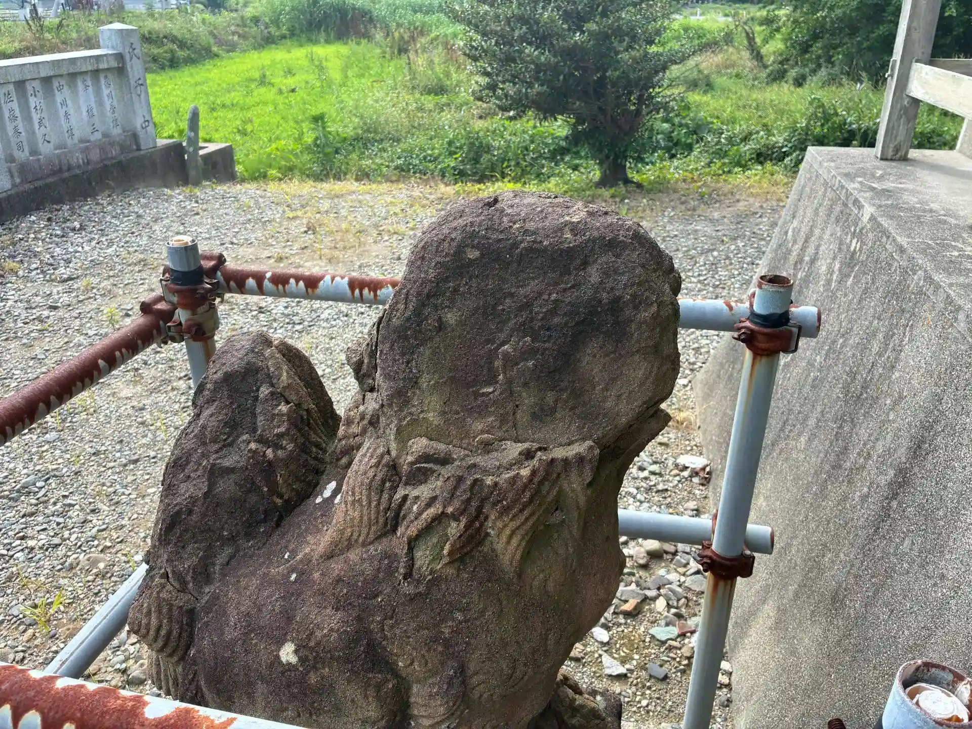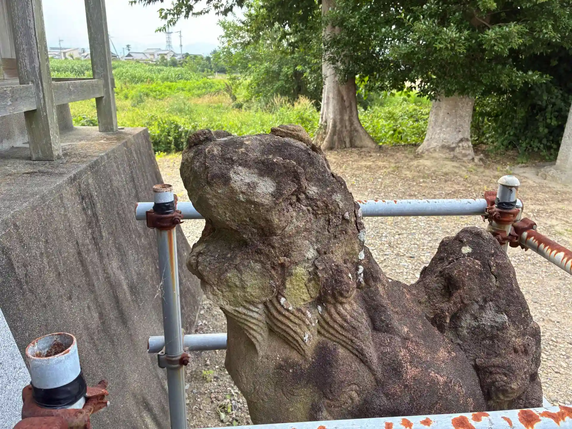 鳥居から参道が150mほど延びていて桜が植えられていますので、春は見事な景色になるのではと思います。狛犬は新しいですが、古いものも本殿の両脇にしっかり置かれています。顔がわからないくらい古いものだと推測します。また、こちらの向拝の虹梁の上にトラのような生き物が彫られていて、不思議な感じがしました。