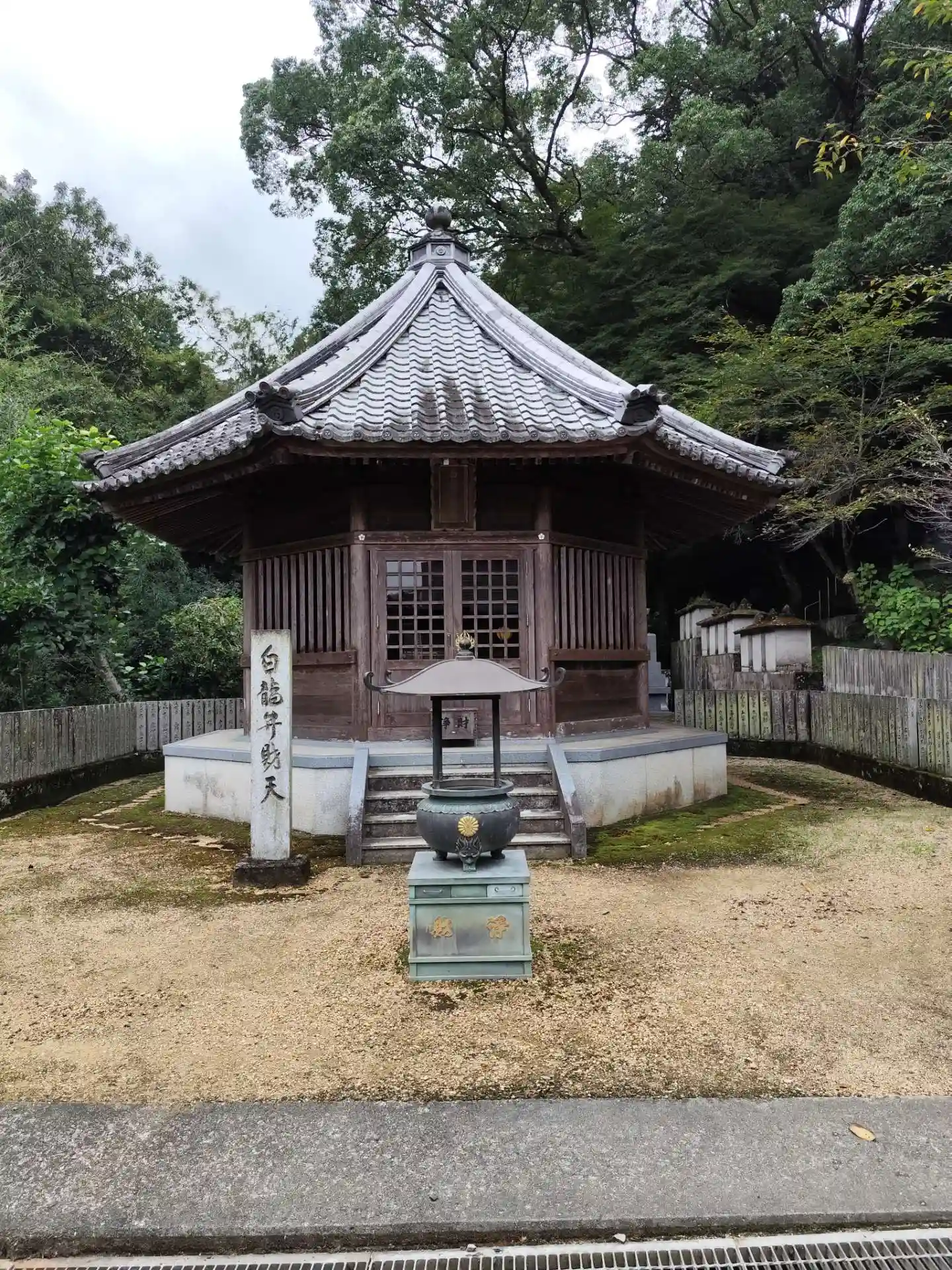 本堂にムウ買って参道左手少し離れた位置にある、印象的な六角形の形をした<弁天堂>。