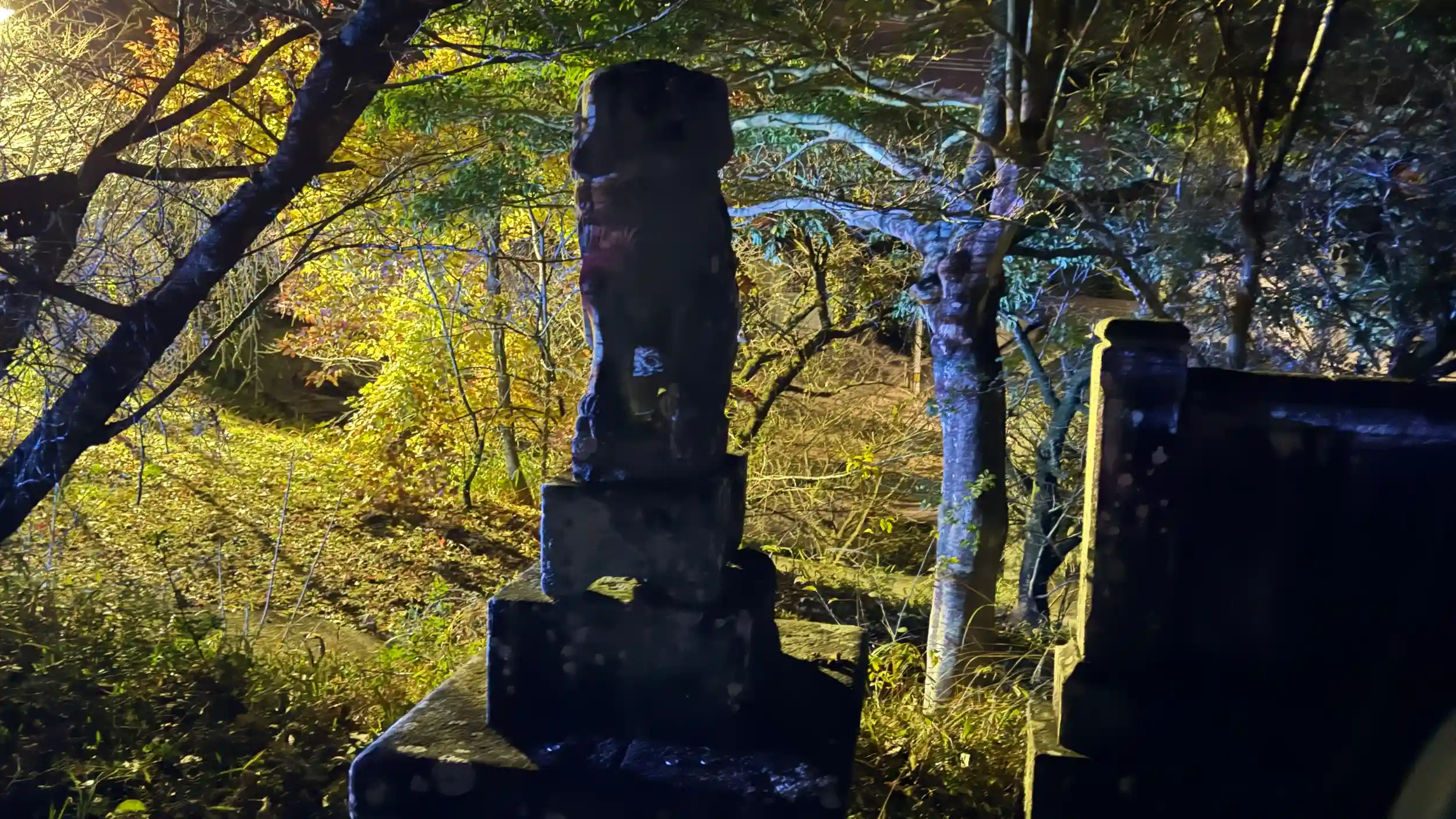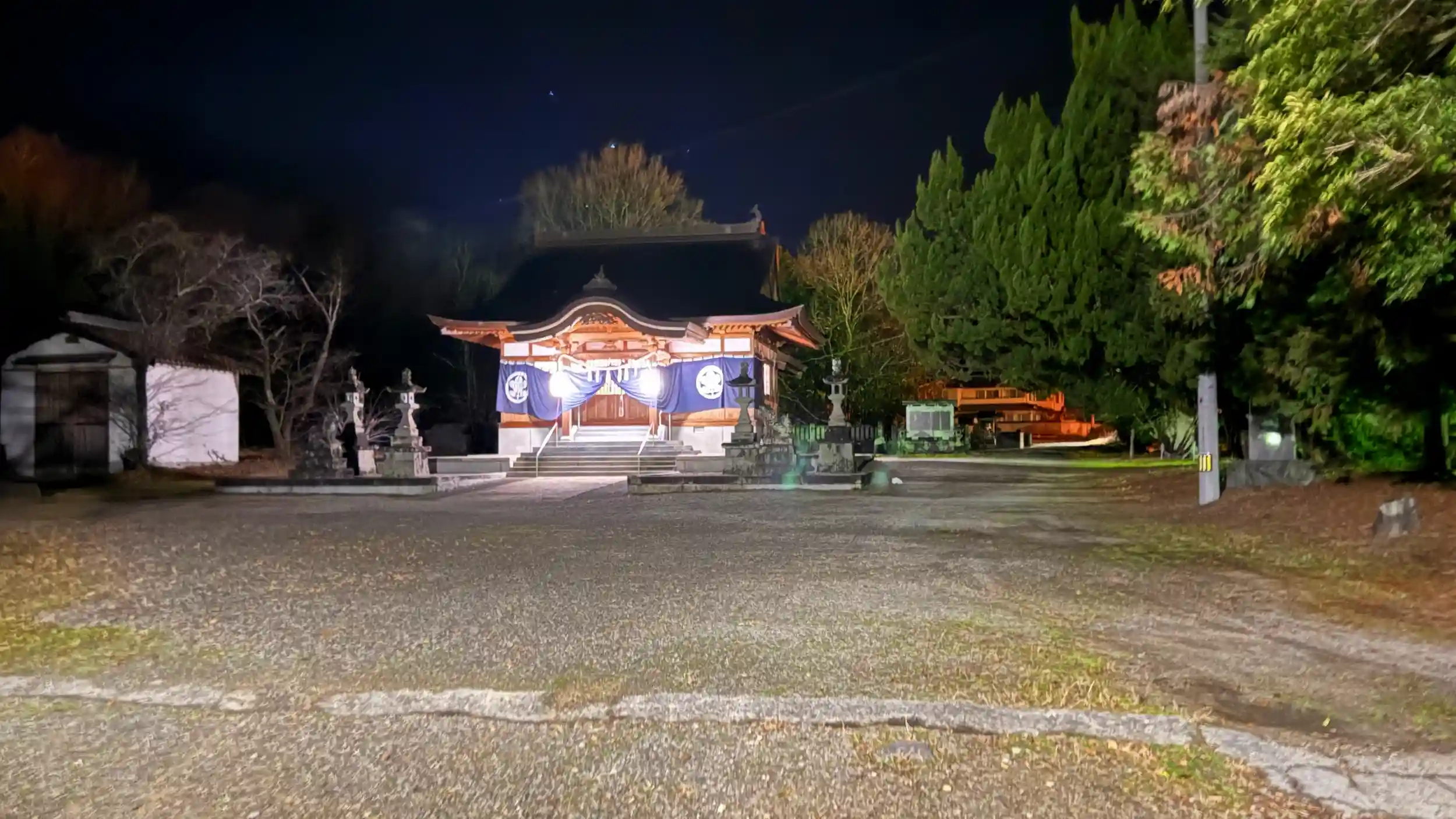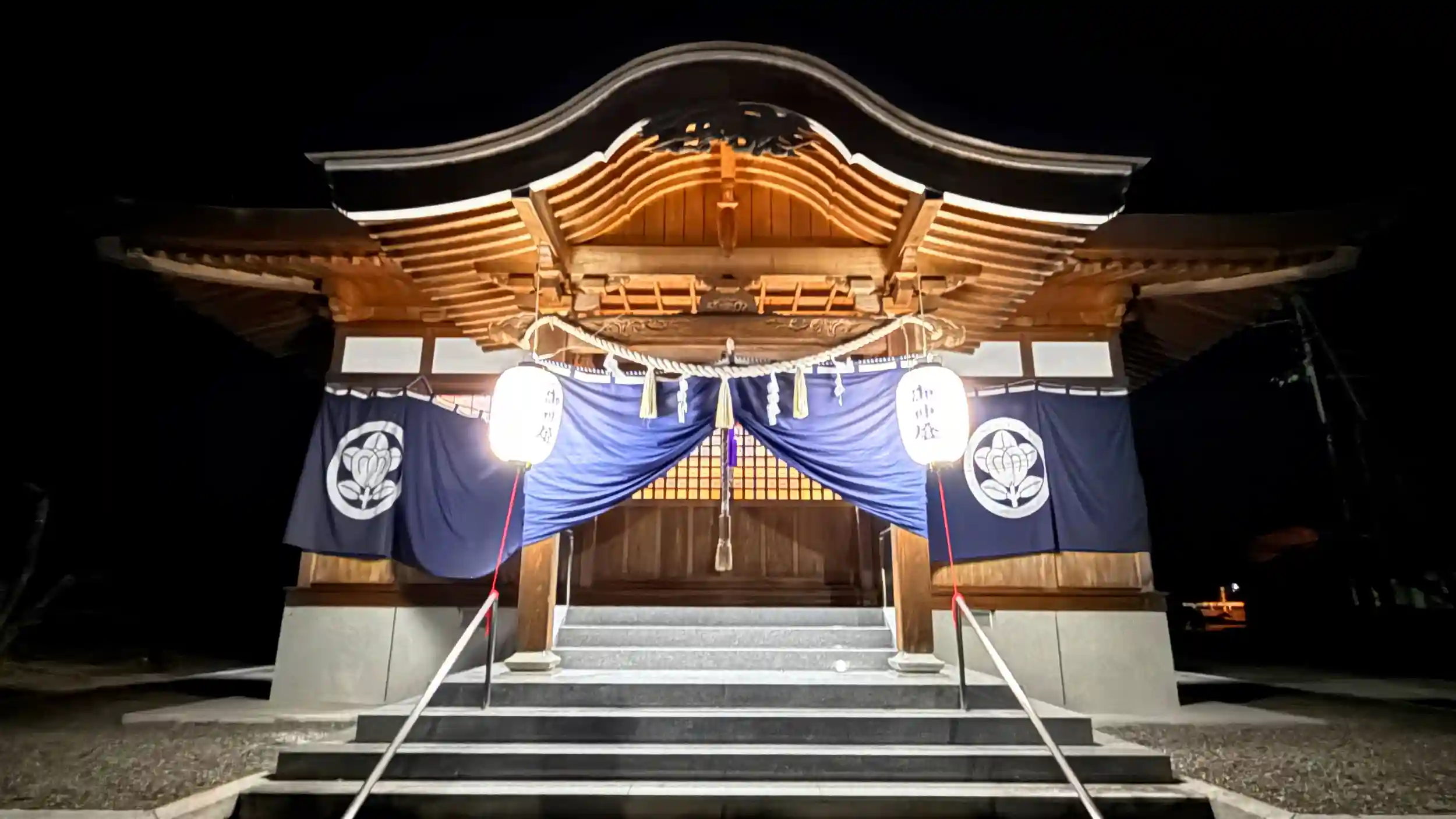 御祭神等不明(暗かったので御由緒書き等発見できませんでした)初詣のためにしっかりと明かりが参道にも灯り、拝殿もとてもあかるく参拝しやすかったです 阿波市立市場歴史民俗資料館の近くです、桜の名所でもあるようです「やねこじき」という行事があり、四百年の昔から続き、毎年5月5日(子供の日)を中心に商店街で賑わい、市場の気さくで明るい住民性を表現する全国的にも珍しい催しで、最近復活して執り行われているようです。