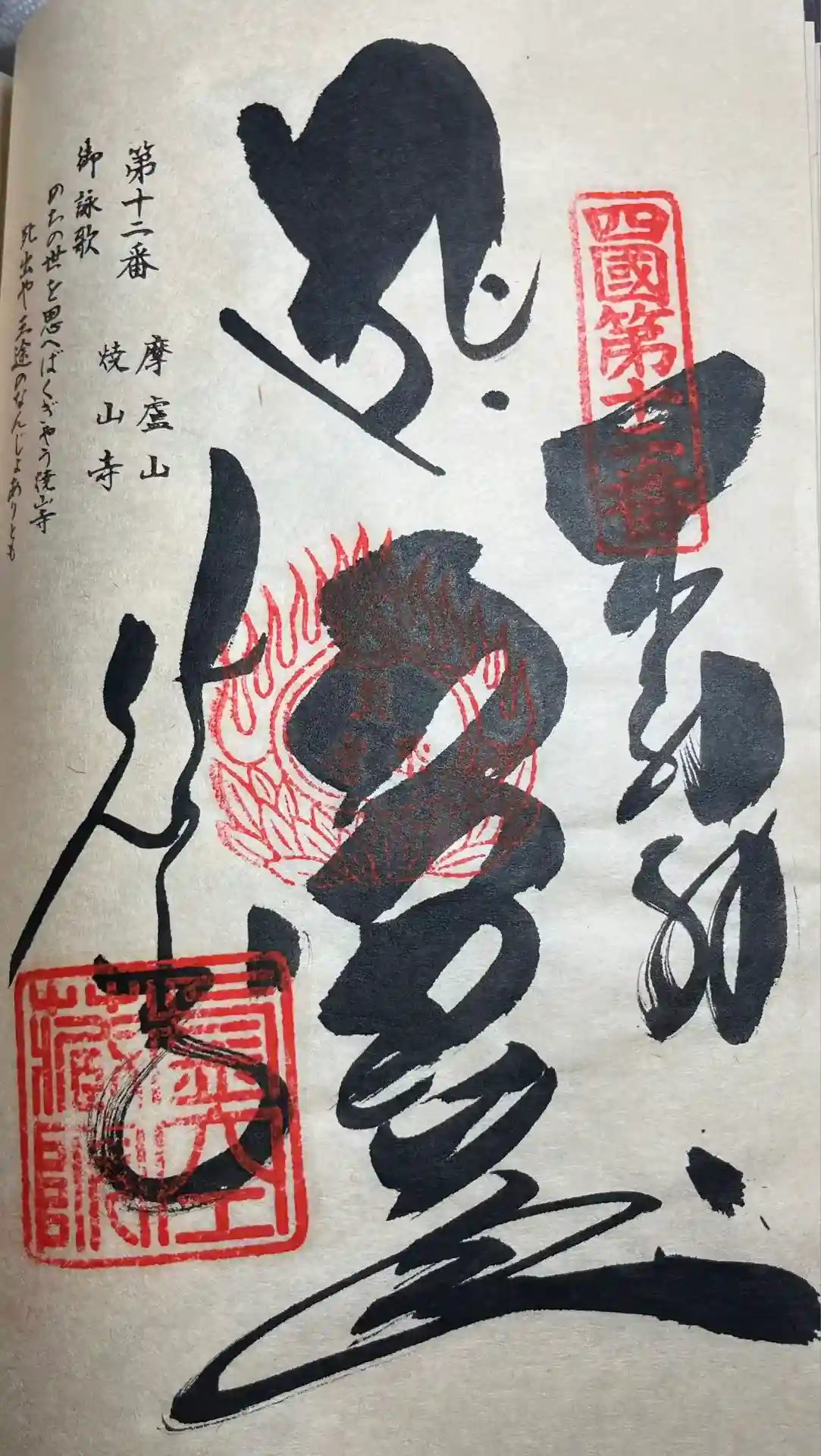 楽しみ方焼山寺山(標高938メートル)の8合目近くにあり、四国霊場で2番目に高い山岳札所。剣山や白髪山など四国山脈の山々がひろがる眺望はすばらしい。四国霊場には「遍路ころがし」といわれた札所がいくつかあるが、焼山寺もその一つで、昔から嶮しい坂道の難所を辿る「修行の霊場」であった。いまは山上まで車道が通っている。縁起によると、飛鳥時代に役行者が山をひらいて、蔵王権現を祀ったのが寺のはじまりとされている。ところが、この山には神通力を持った大蛇が棲んでおり、しばしば火を吐いて農作物や村人たちを襲っていた。弘仁6年ころ、弘法大師がこの地に巡られた時、一本杉で休んでいた処、阿弥陀様があらわれた夢を見た。目を覚ますと目の前が火の海になっている。そこで麓の垢取川で身を清めて山に登ると、大蛇は全山を火の海にして妨害した。大師は「摩廬(水輪の意)の印いん」を結び、真言を唱えながら進んだのだが、大蛇は山頂近くの岩窟で姿をあらわした。