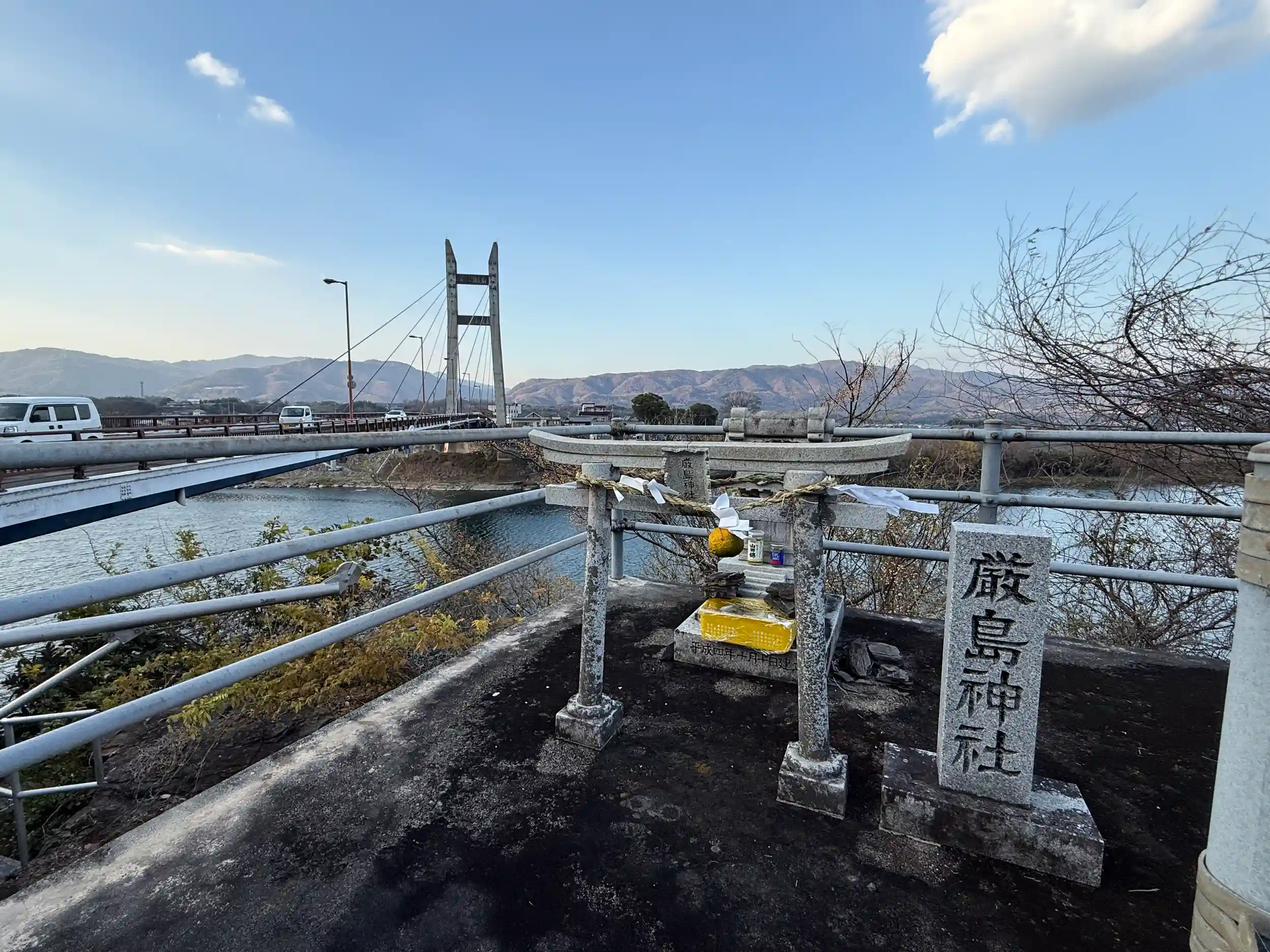 岩津橋の信号待ちで見つけました こんなところに神社があるしかも河川管理の建屋の上にとビックリ、交通安全と橋の安全を見守って頂いているようでした