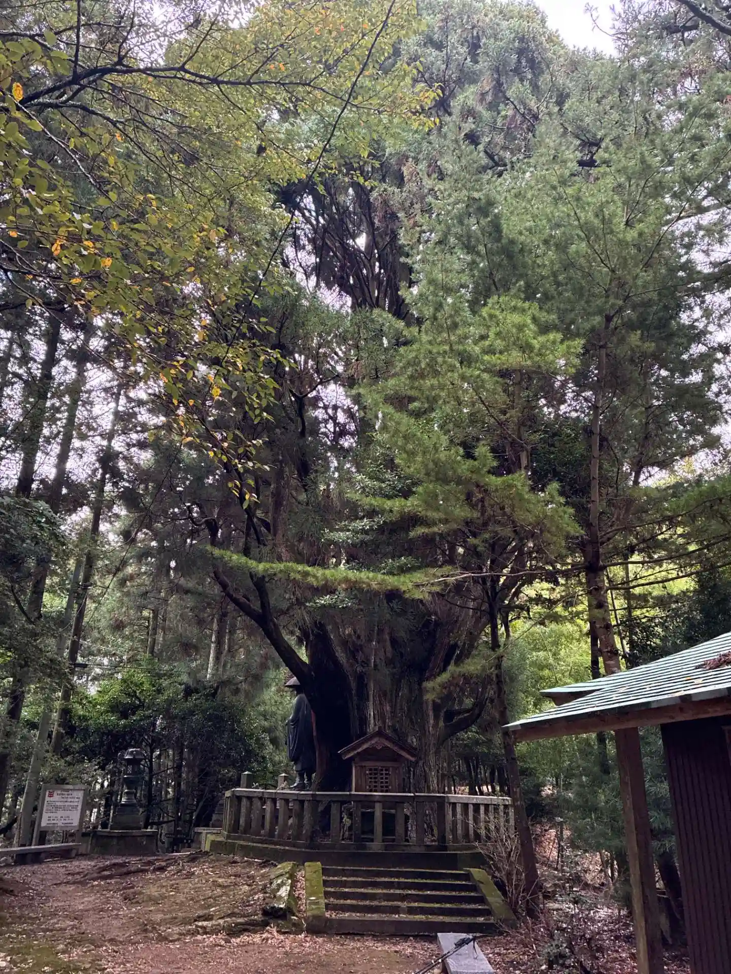 弘法大師の像と左右内(そうち)の一本杉が出迎えてくれます