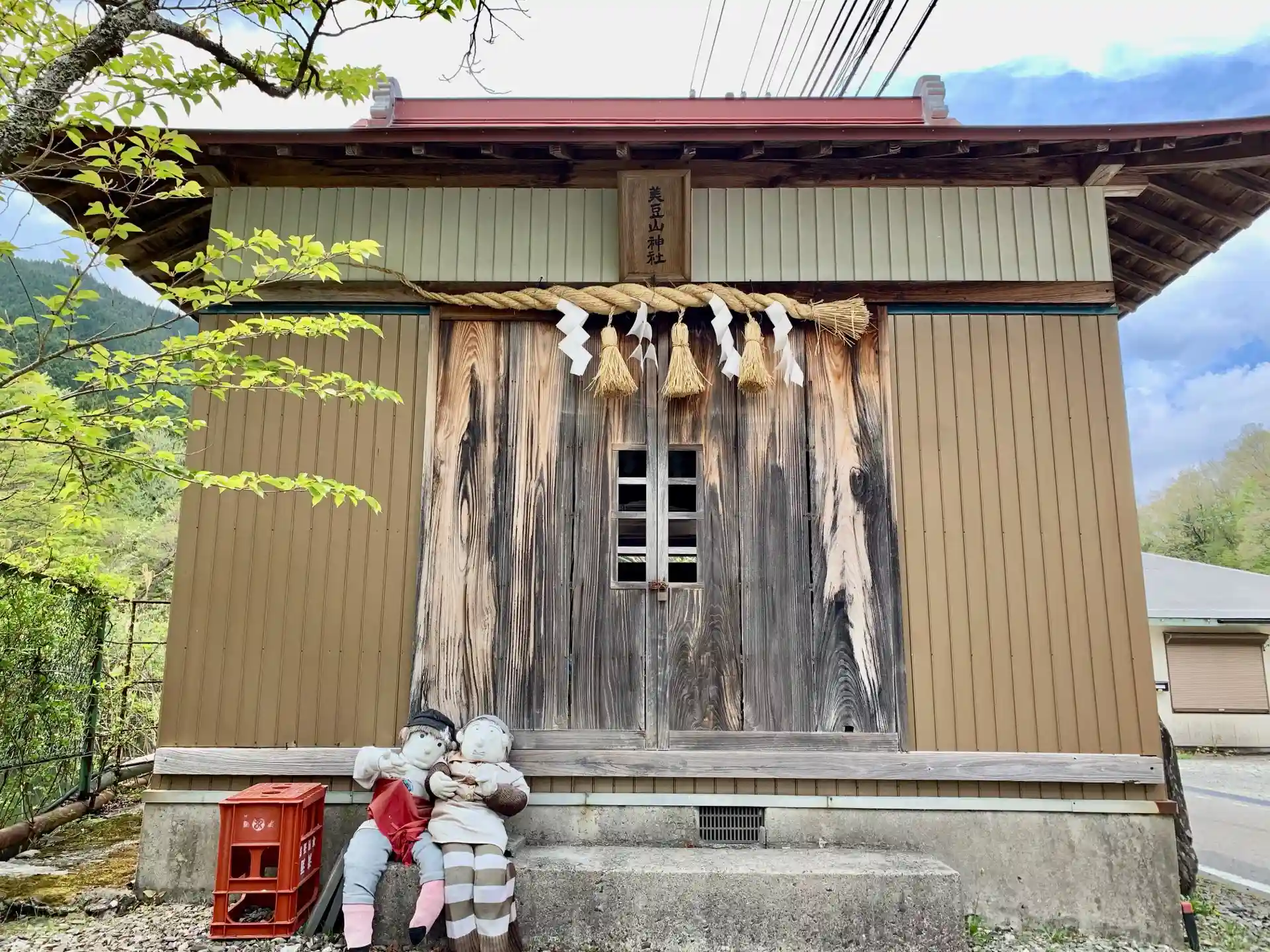 境内ではかかしが木登り、拝殿横にかかしが仲良く並んでいる。