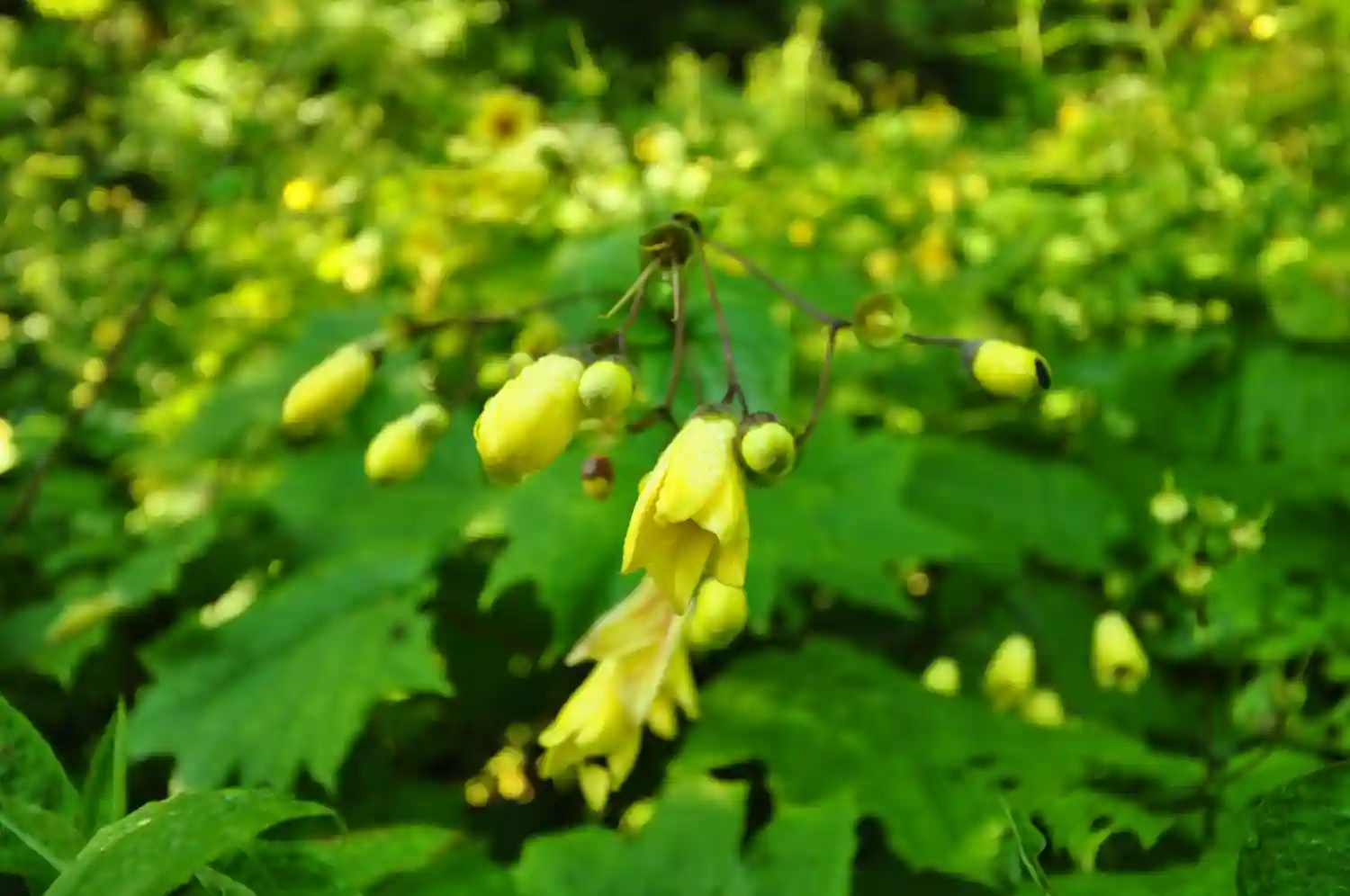 キレンゲショウマ(ユキノシタ科)は、深山に生える多年草。花は黄色でラッパ状になり、斜め下を向く。~さわやかな月光の花は凛として気高い(宮尾登美子)~