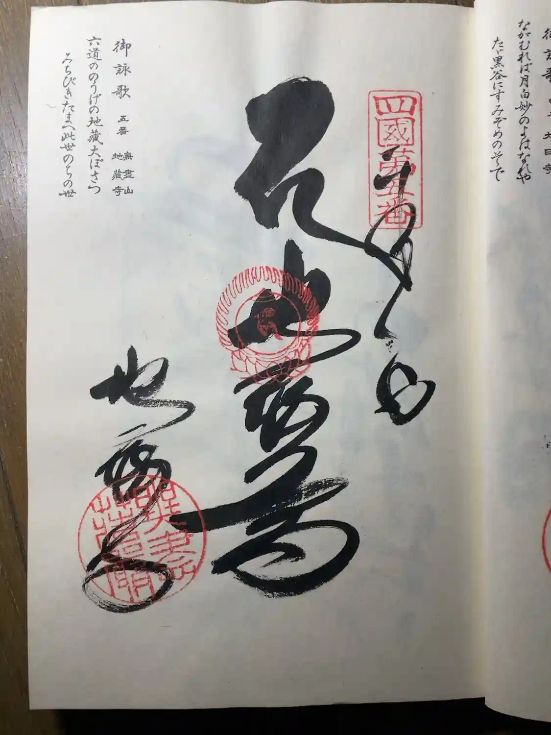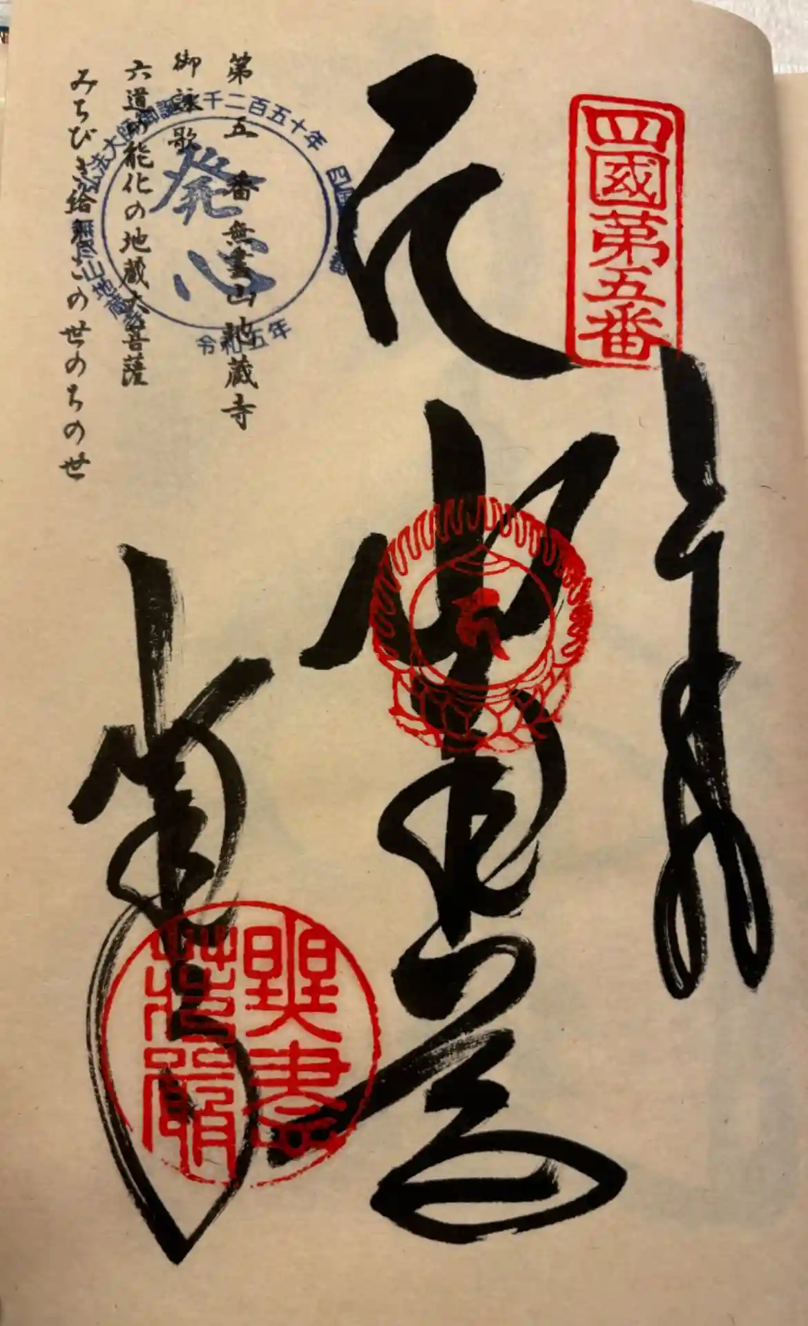 真ん中に梵字と地蔵尊、左下に地蔵寺と書かれ、右上に四国第五番の印、真ん中に梵字の印、左下に無盡荘厳の印が押されています。 | |||