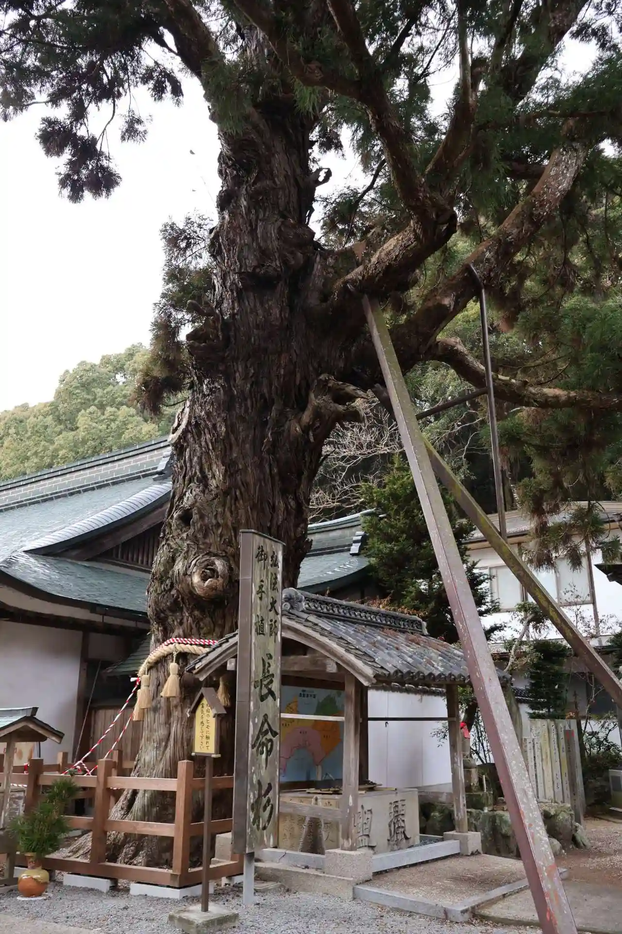 樹齢1,200年以上とされ、太い幹には紅白の紐が繋がれ、この紐に触れると健康長寿のご利益があるそうです