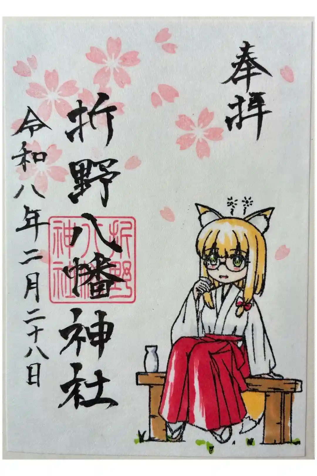 参拝をし終わって社務所はどこかな?ときょろきょろしてると突然社殿の前に駐車していたスポーツカーから人が降りてきて「今日から春の御朱印になりました」と声をかけてくれました。こんな形で宮司さんが現れるとは思いませんでした(笑)。宮司さんにお会いできたので直書きをお願いしました。しばらく待っていると宮司さんが申し訳なさそうな顔をしながら現れて一言「失敗しました・・・」。インクがにじんでしまってうまくできなかったようです。まぁ一発勝負だからそんなこともあるよねと思って初穂料を納めようとしたら「お代は結構です。書置きもお付けします。」とのことでお金を受け取っていただけませんでした。丁寧に対応いただいて非常に申し訳ないので、また次回参拝した際にお賽銭として納めようかなと思います。