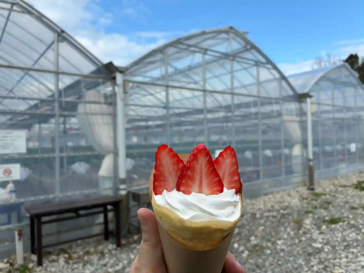 近くの「とだベリーファーム」のミニカフェで苺のクレープいただきました。おいしかった!