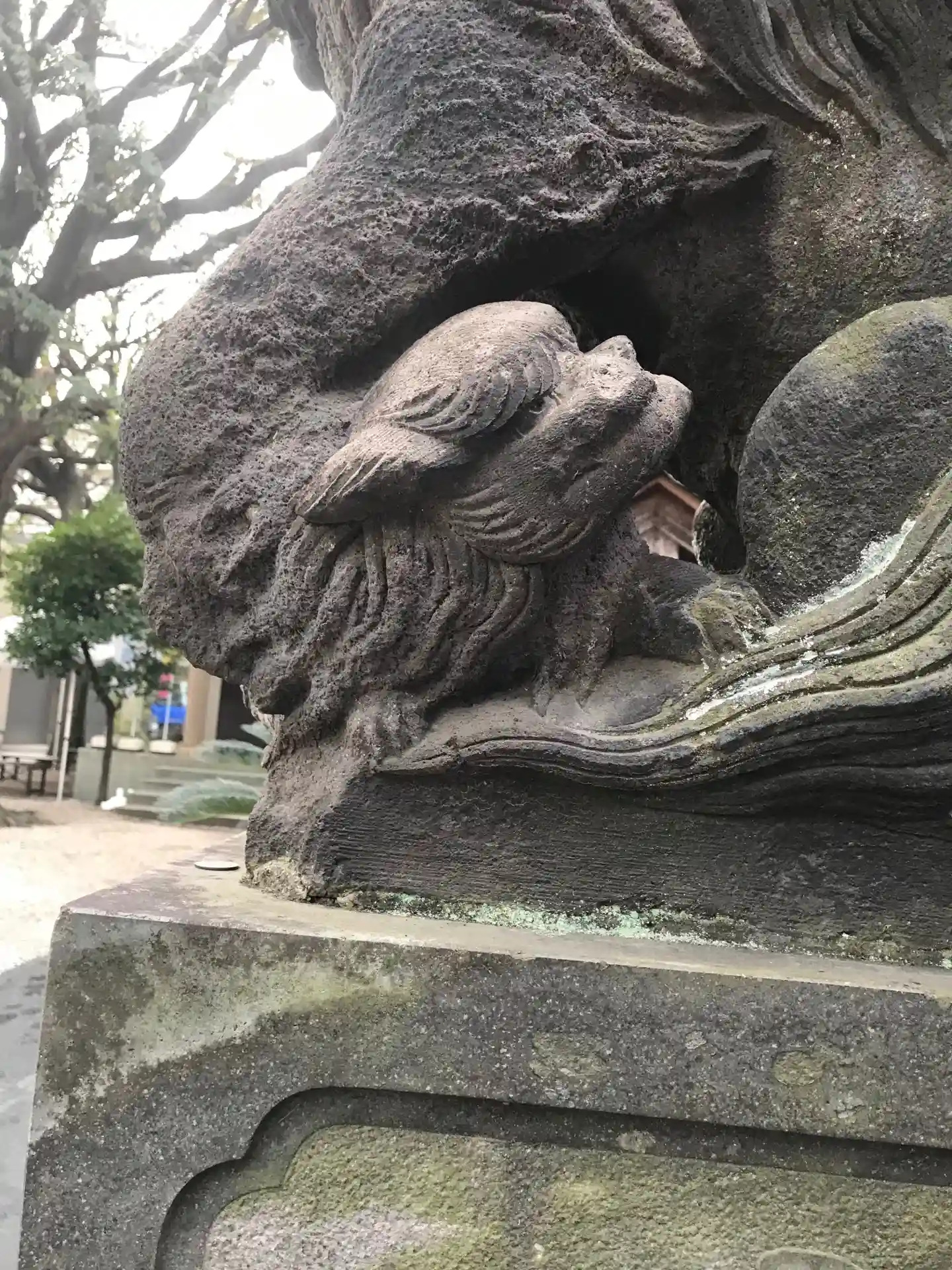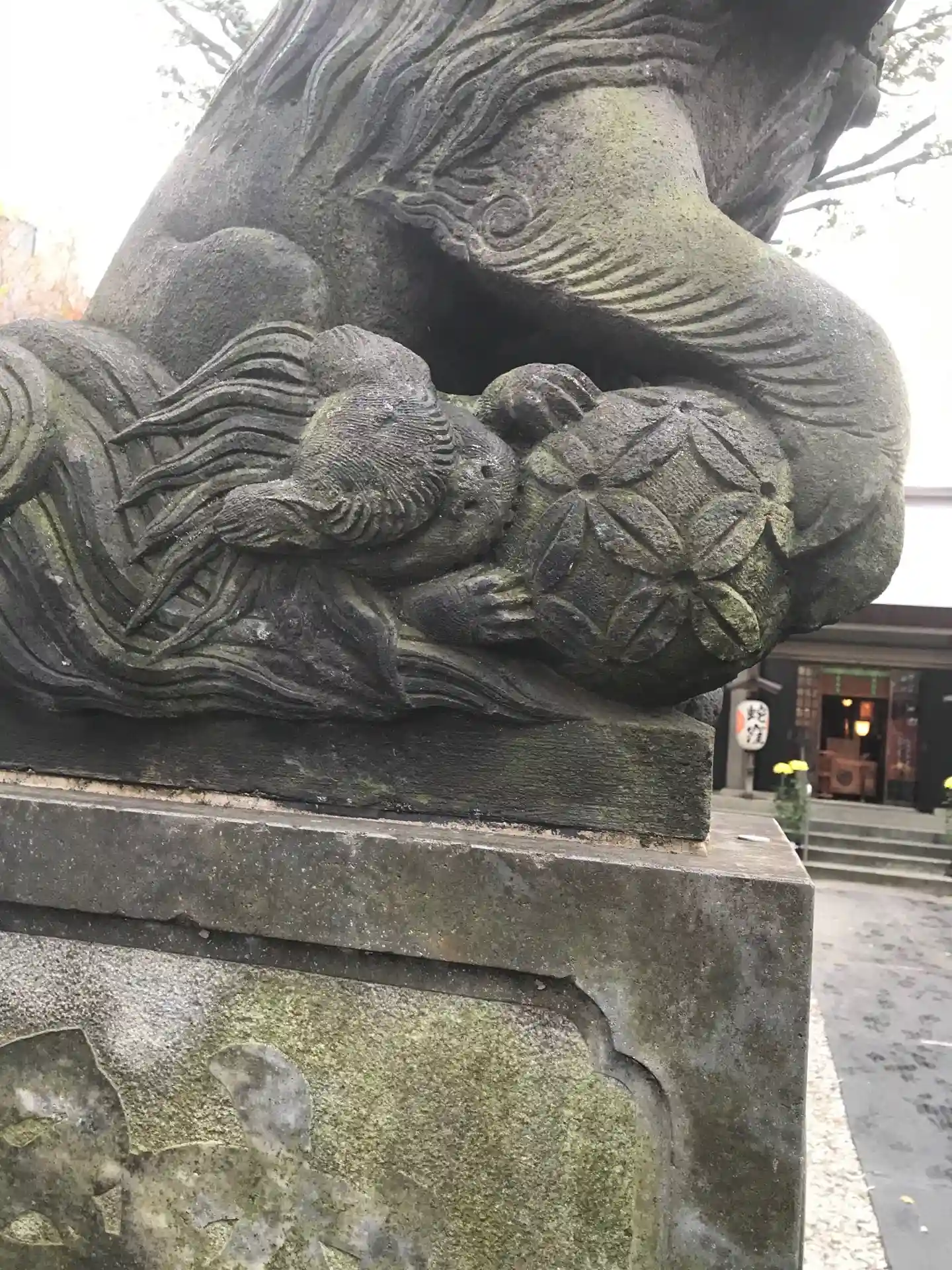 向かって左乗り換え狛犬です。玉に子供が戯れついています