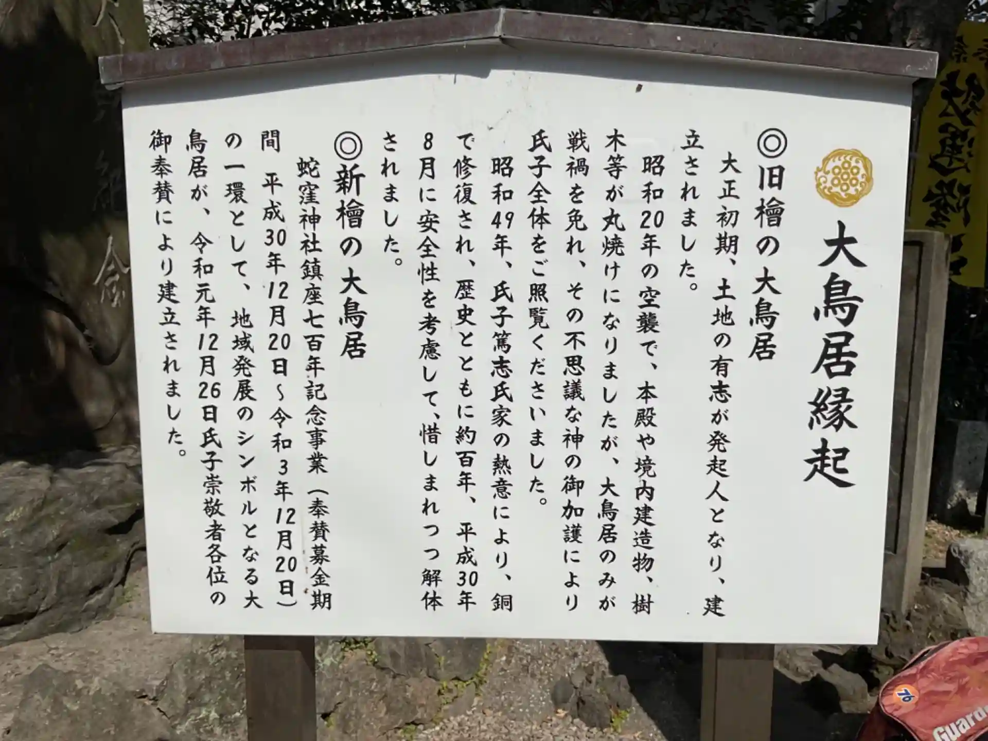 大鳥居は戦火(東京大空襲)にも逃れたが、安全考慮して解体後檜にて新しく作られた事が記されています。