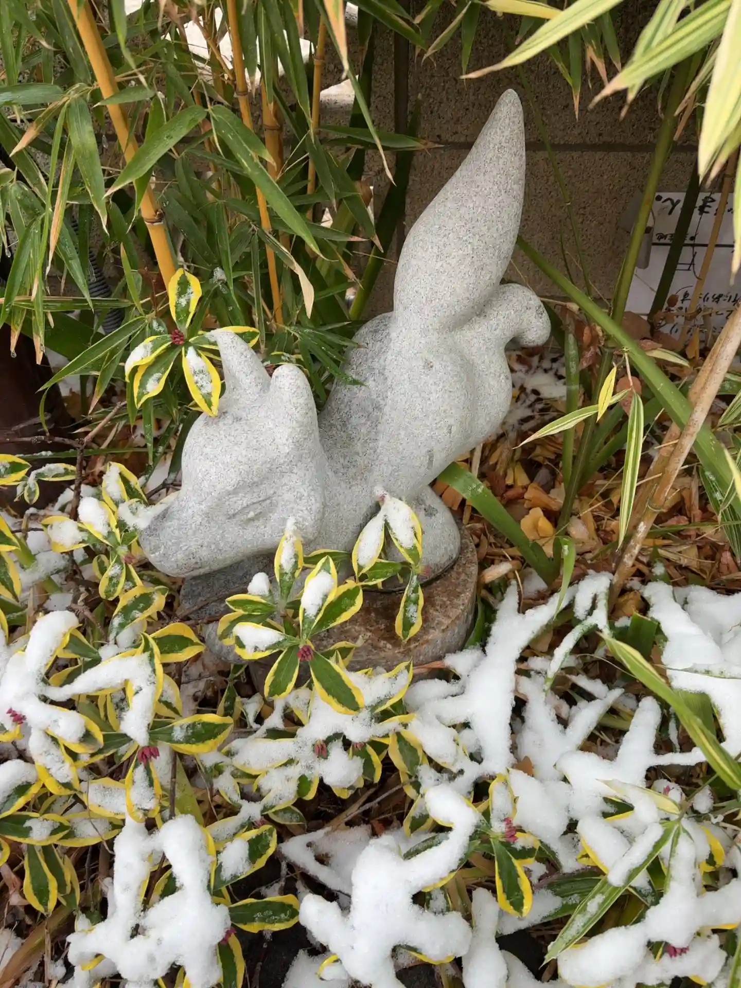 雪ついた笹の中のお狐さん