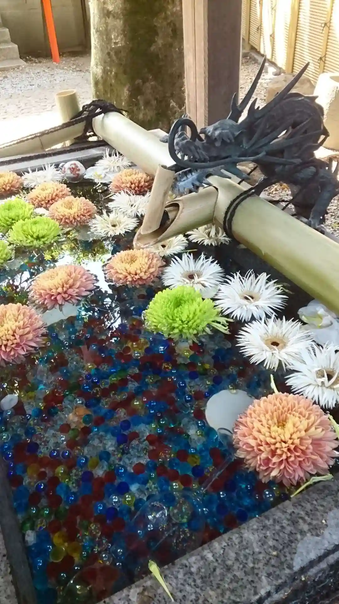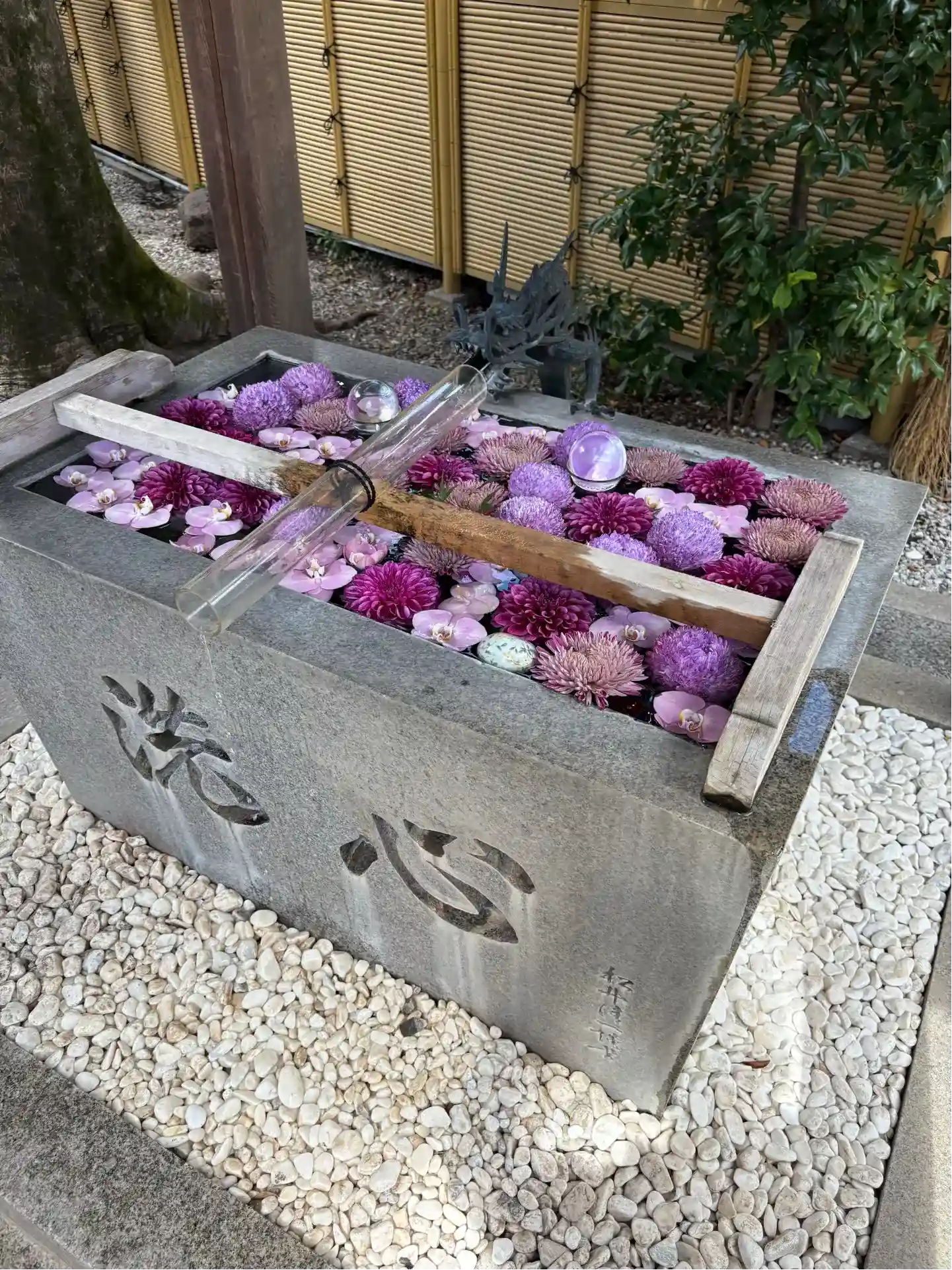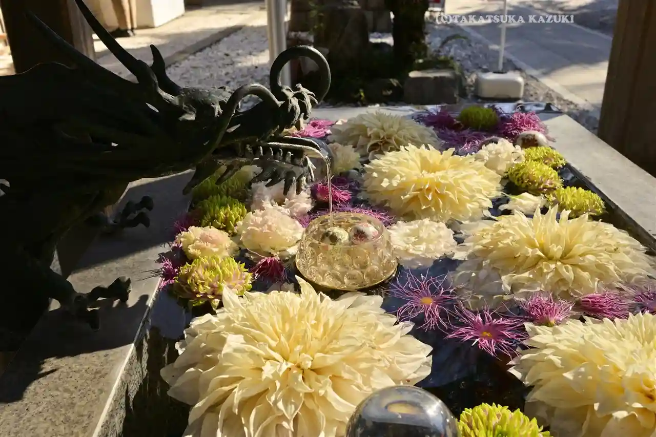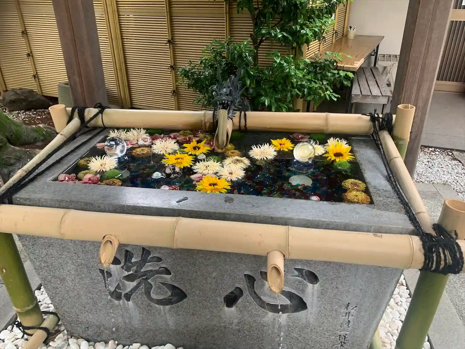 水晶とお花が綺麗な手水舎