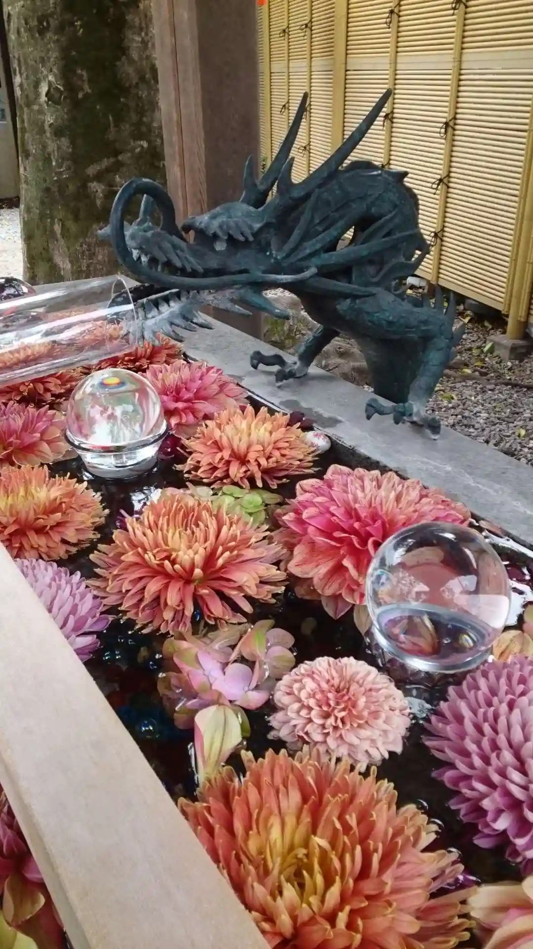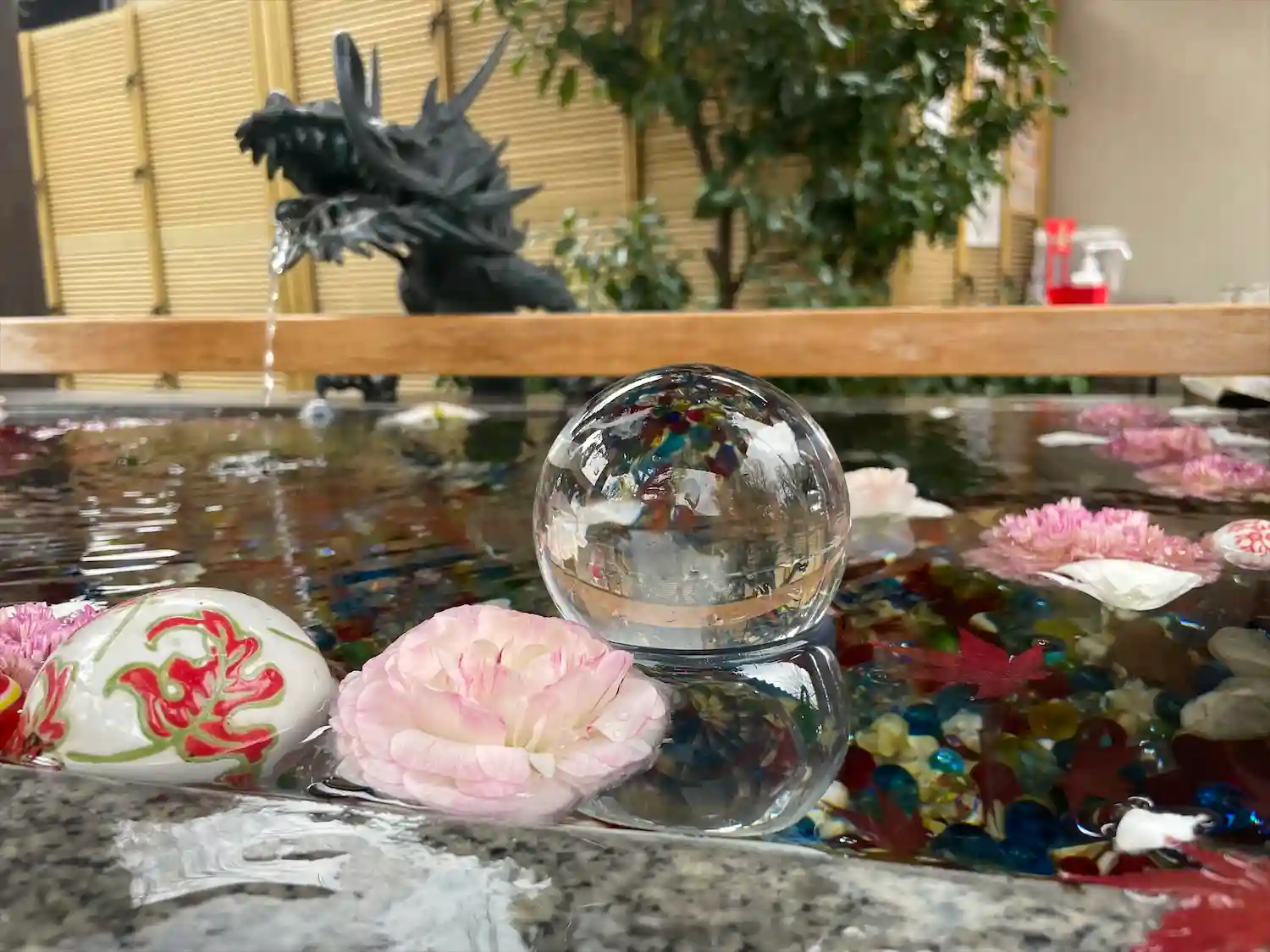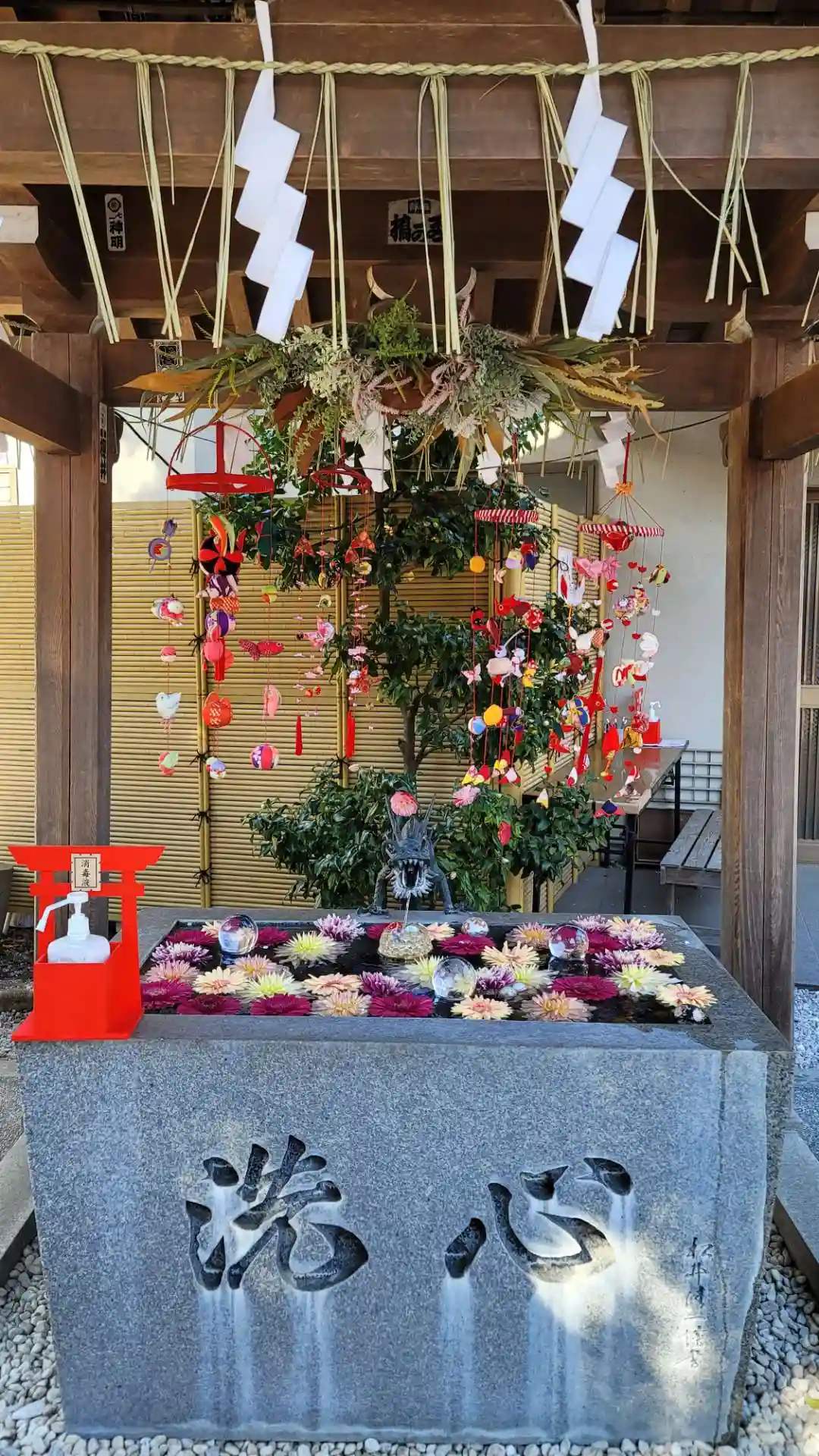 水晶とお花が綺麗な手水舎