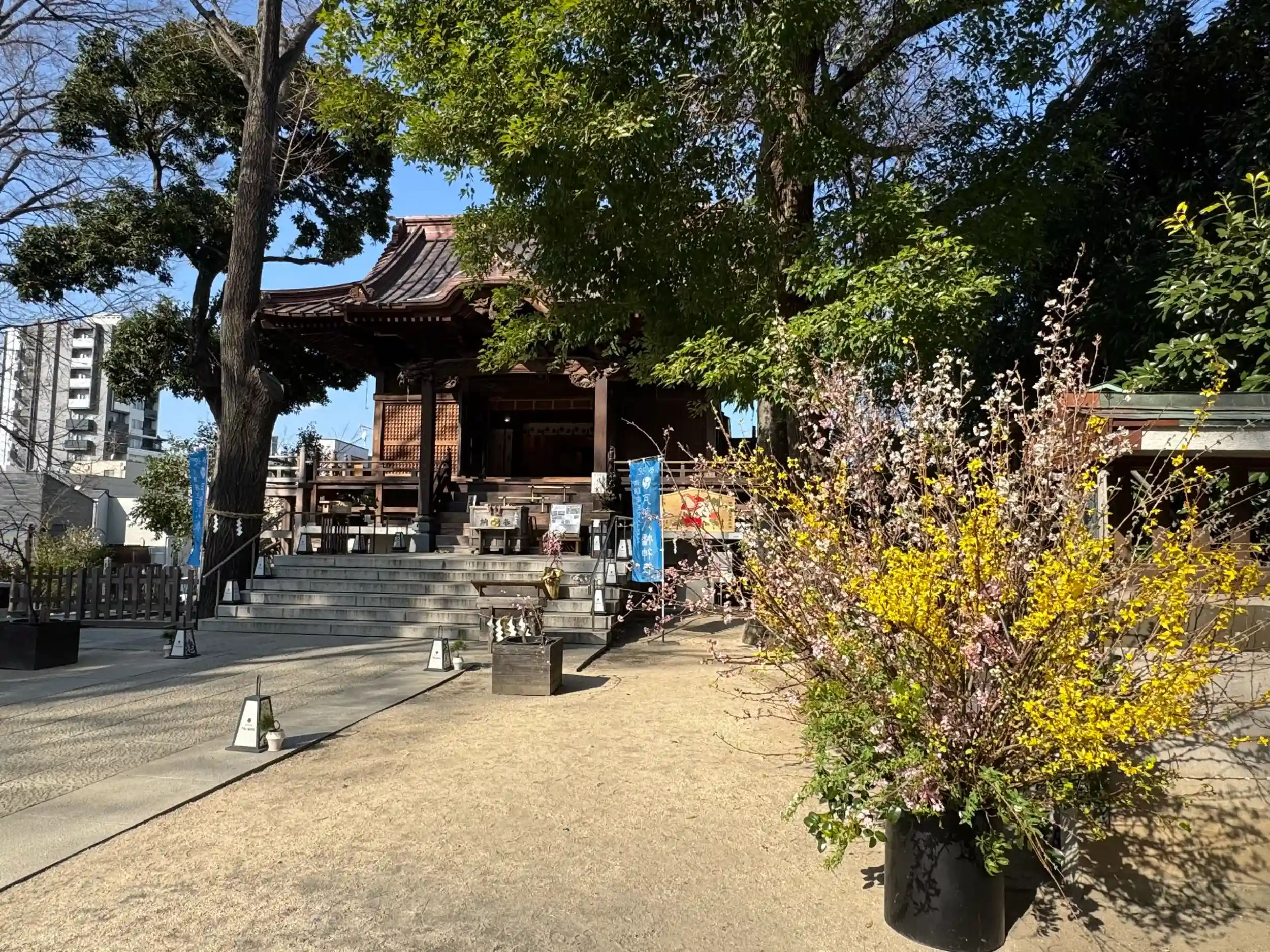 社殿の手前には小さな桜の花の枝と黄色の花が活けられていて、春を感じられる境内になってました。