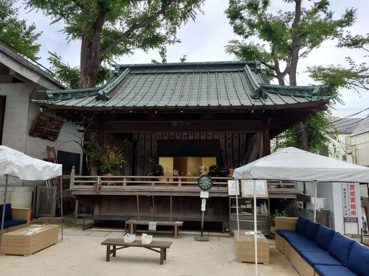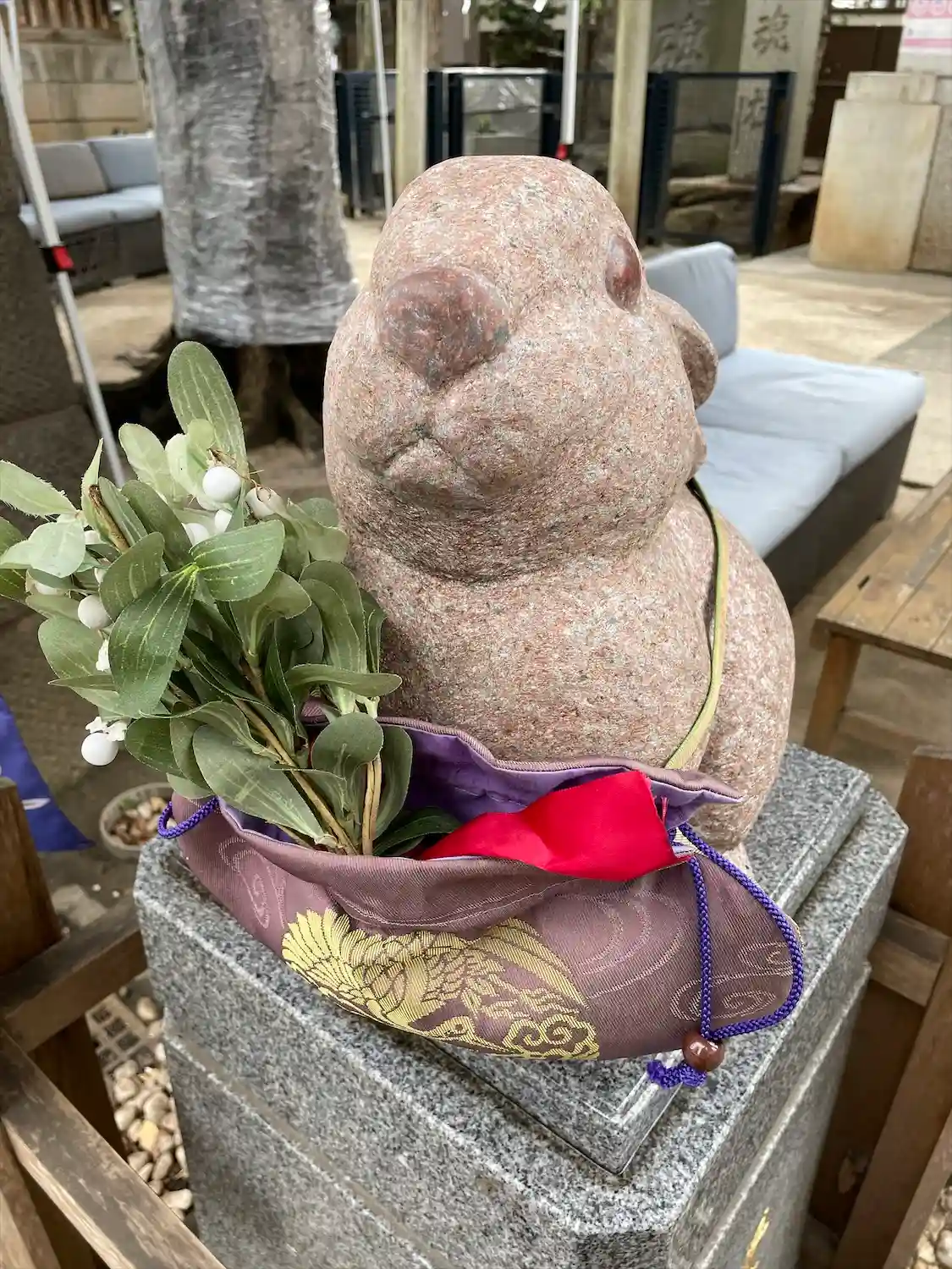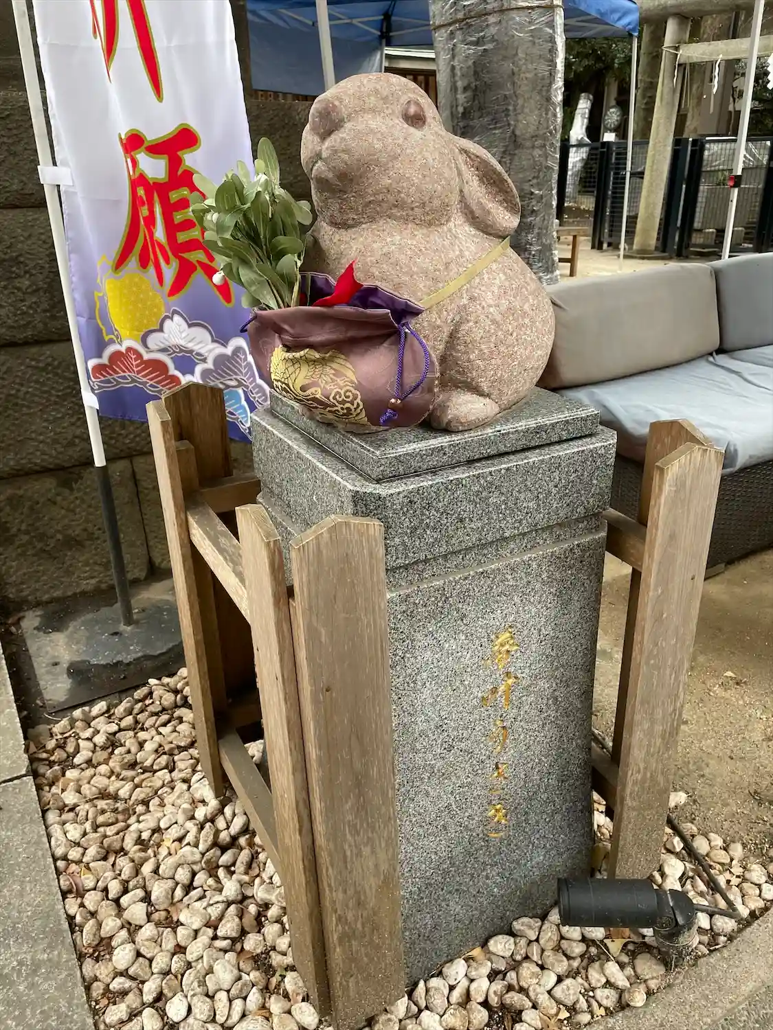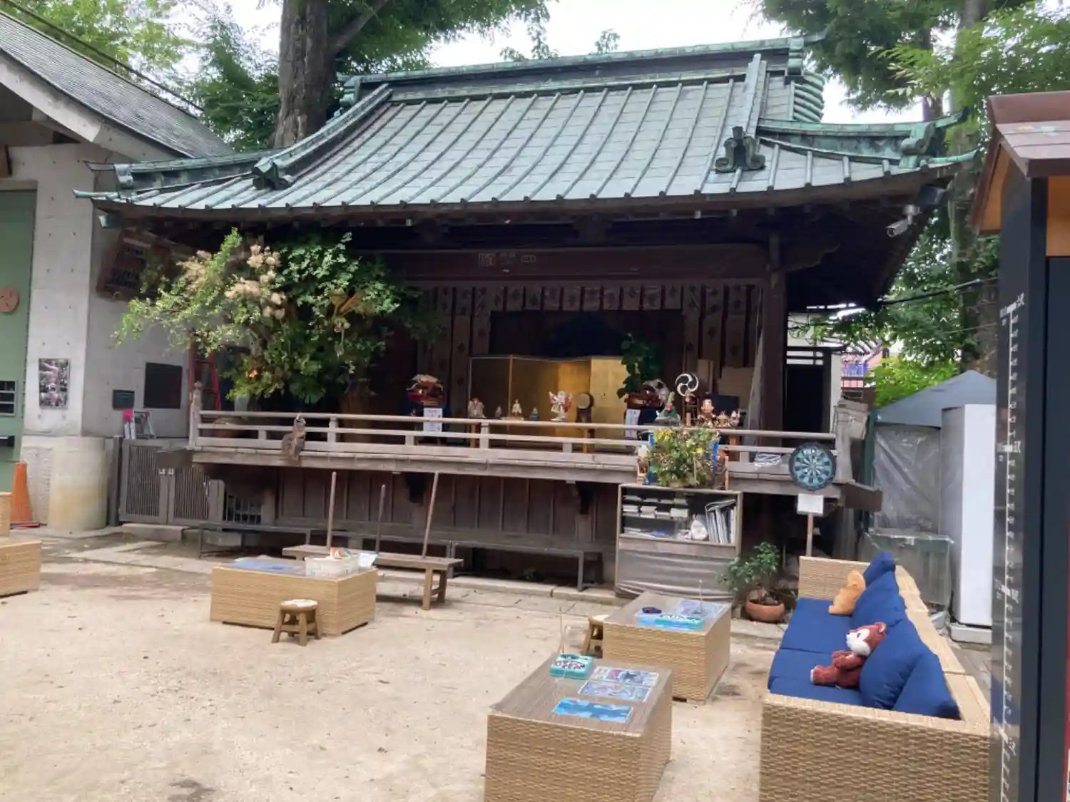 この日は快晴で20度超えだったのに、昼下がりに雨が降りました。憩いの場となっているソファのクッションをあわてて神楽殿に放り込んだようです。