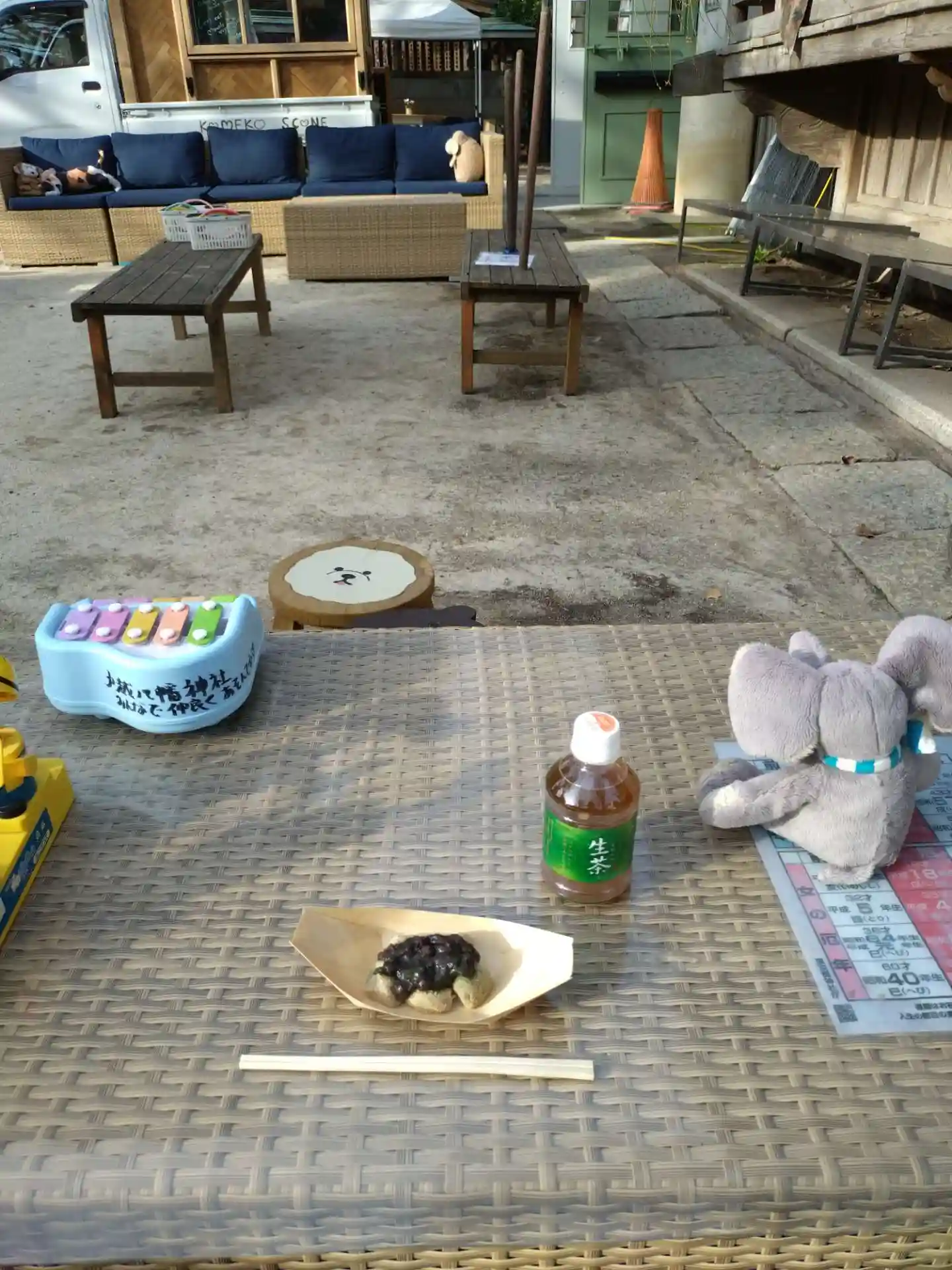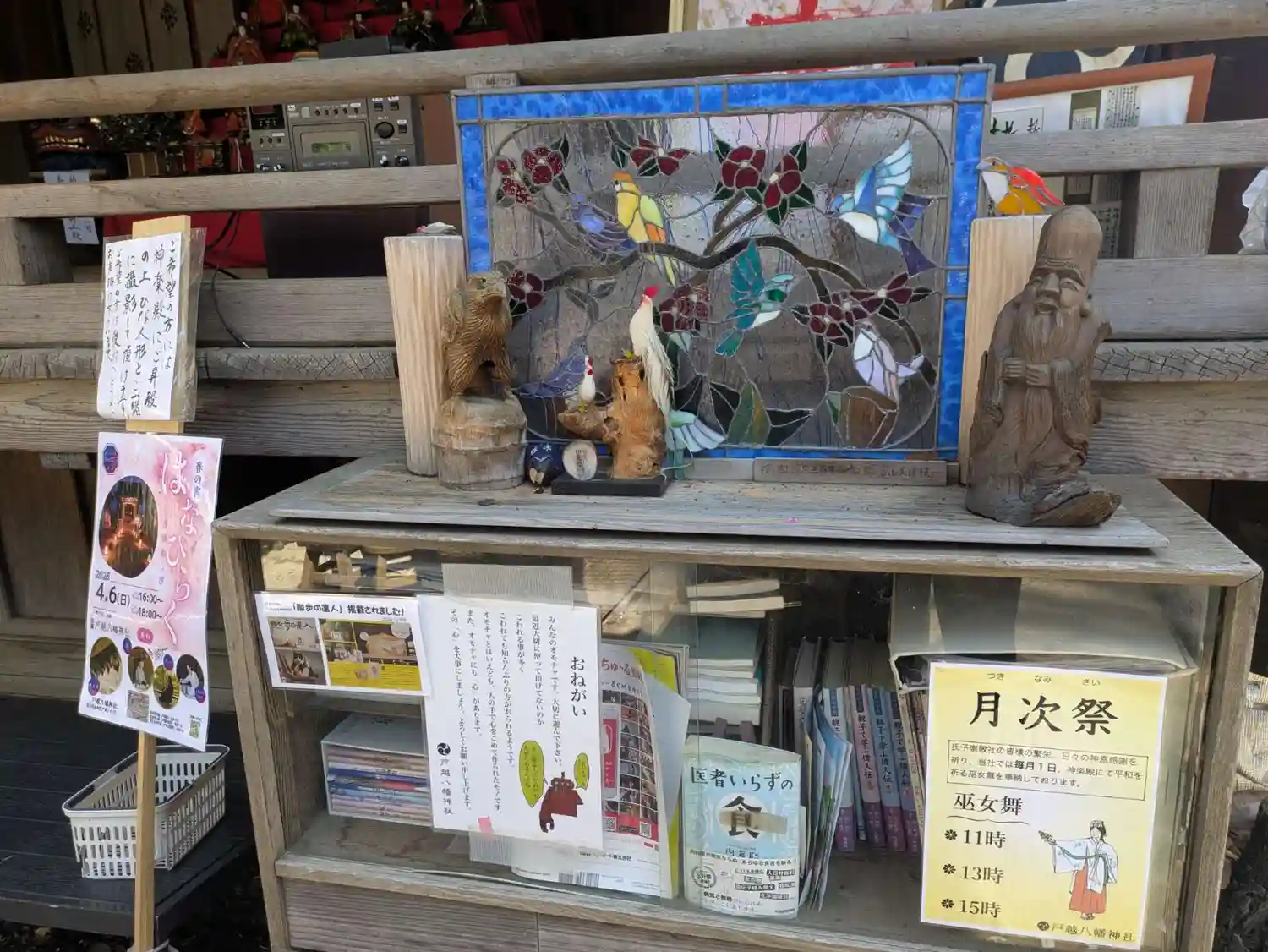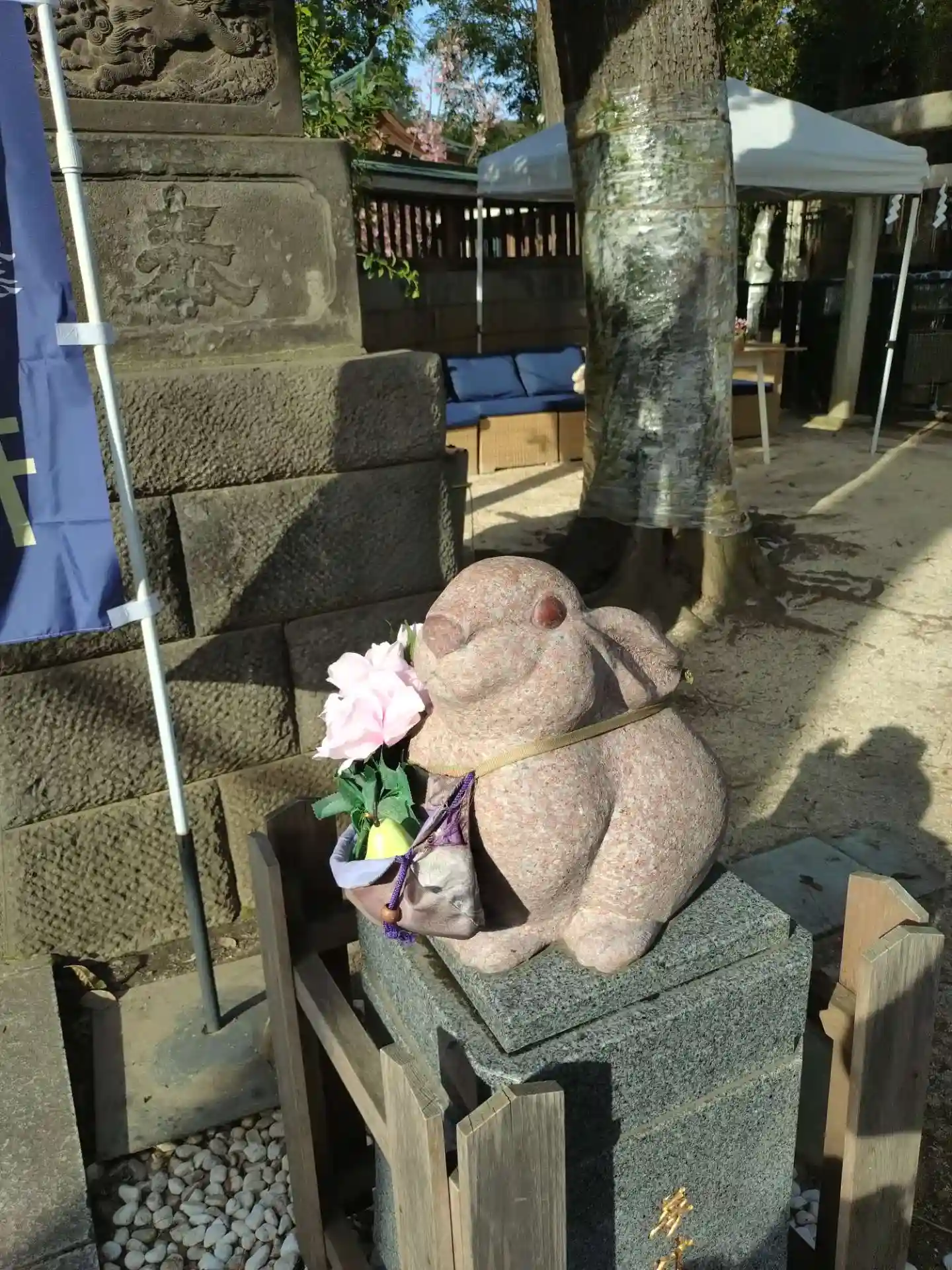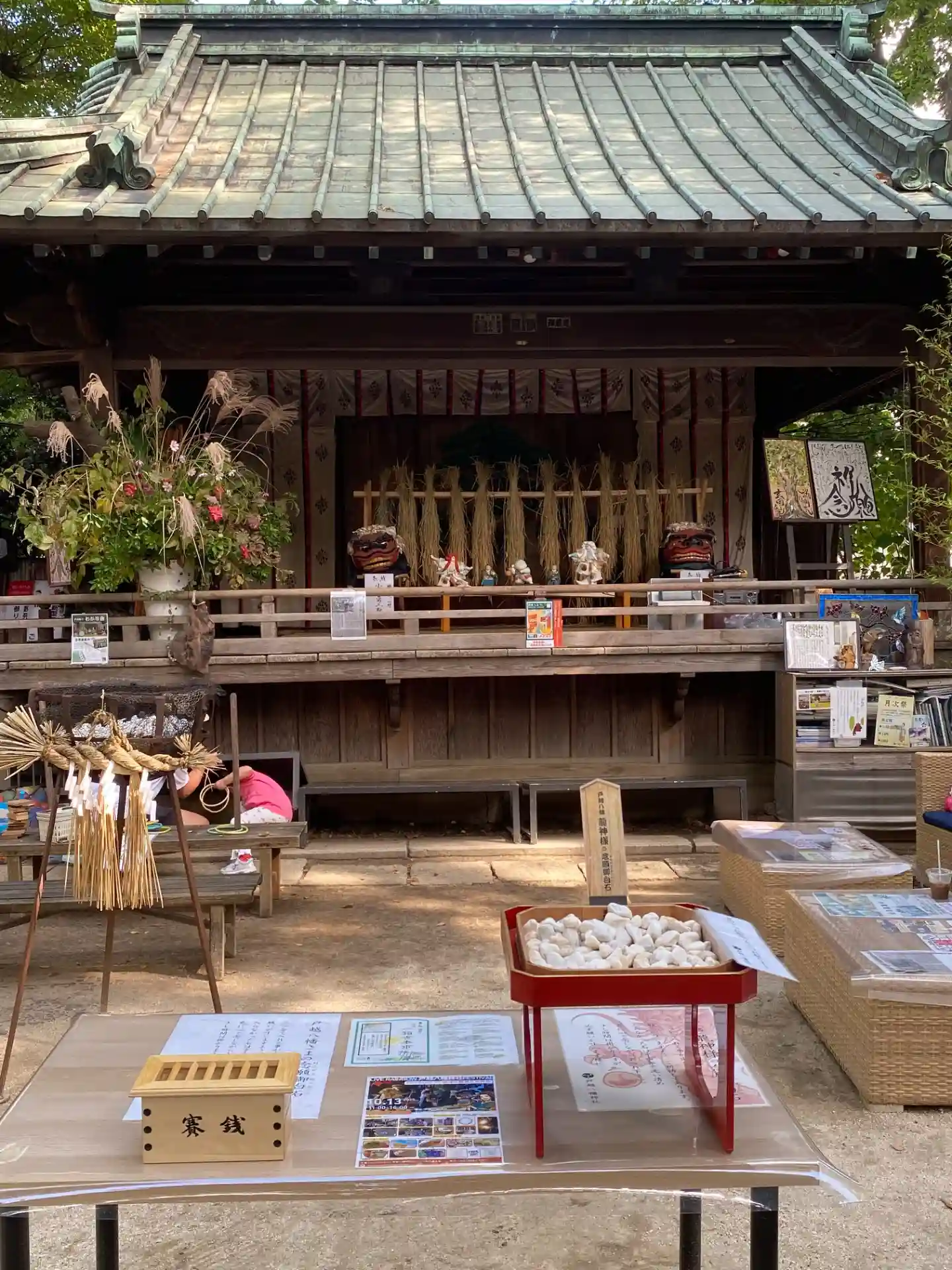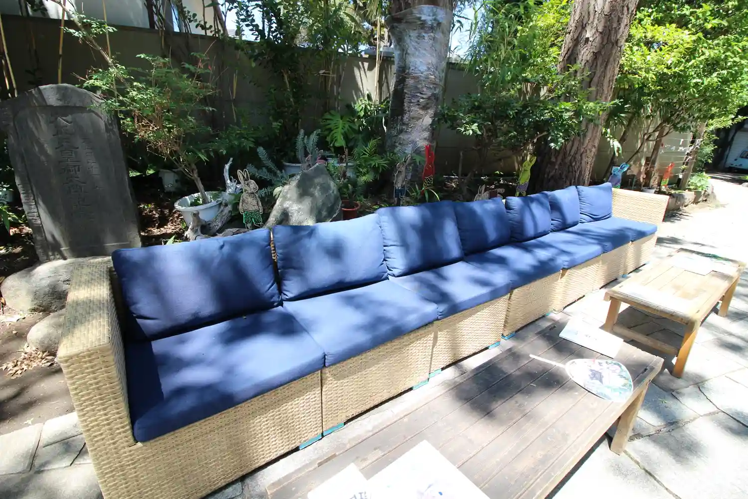 この日は快晴で20度超えだったのに、昼下がりに雨が降りました。憩いの場となっているソファのクッションをあわてて神楽殿に放り込んだようです。