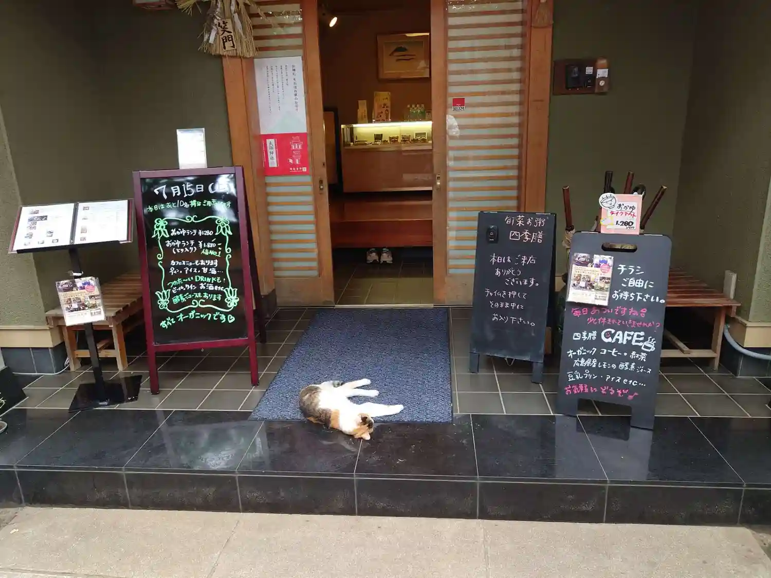 参道の右側にあるオーガニックレストラン&カフェ『四季膳』と奥が『社務所』