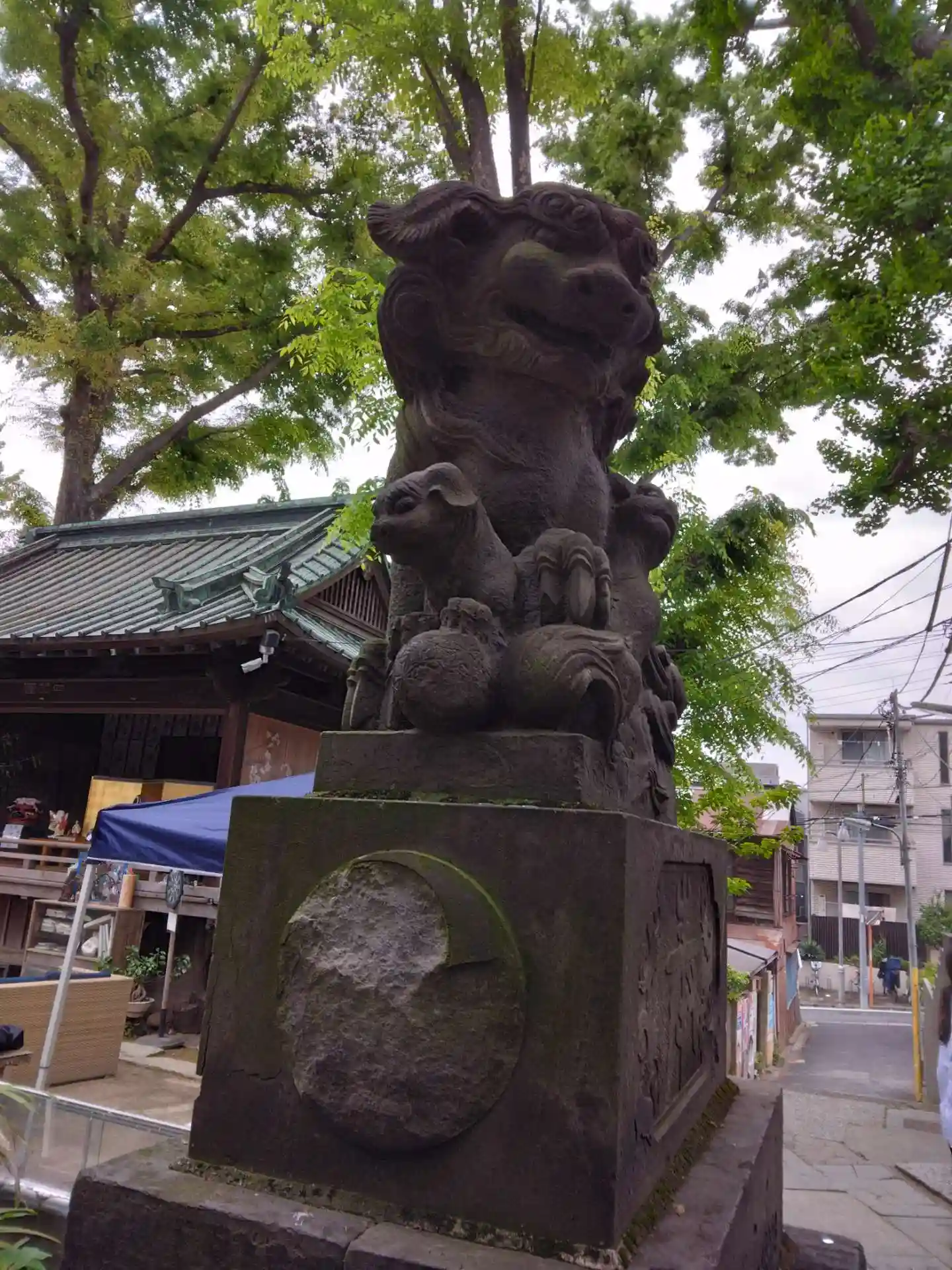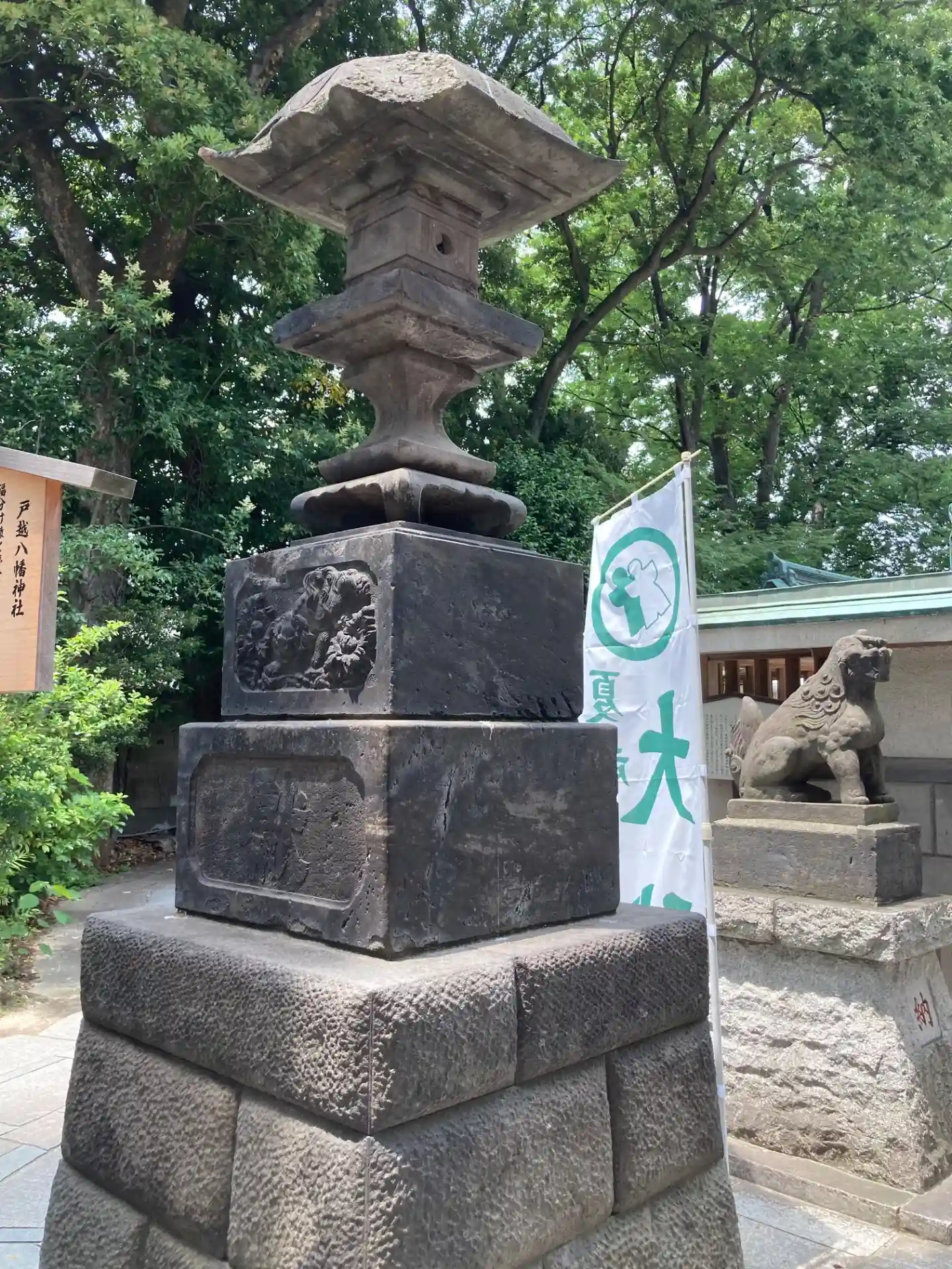 拝殿に近い灯篭にも狛犬様のレリーフ。