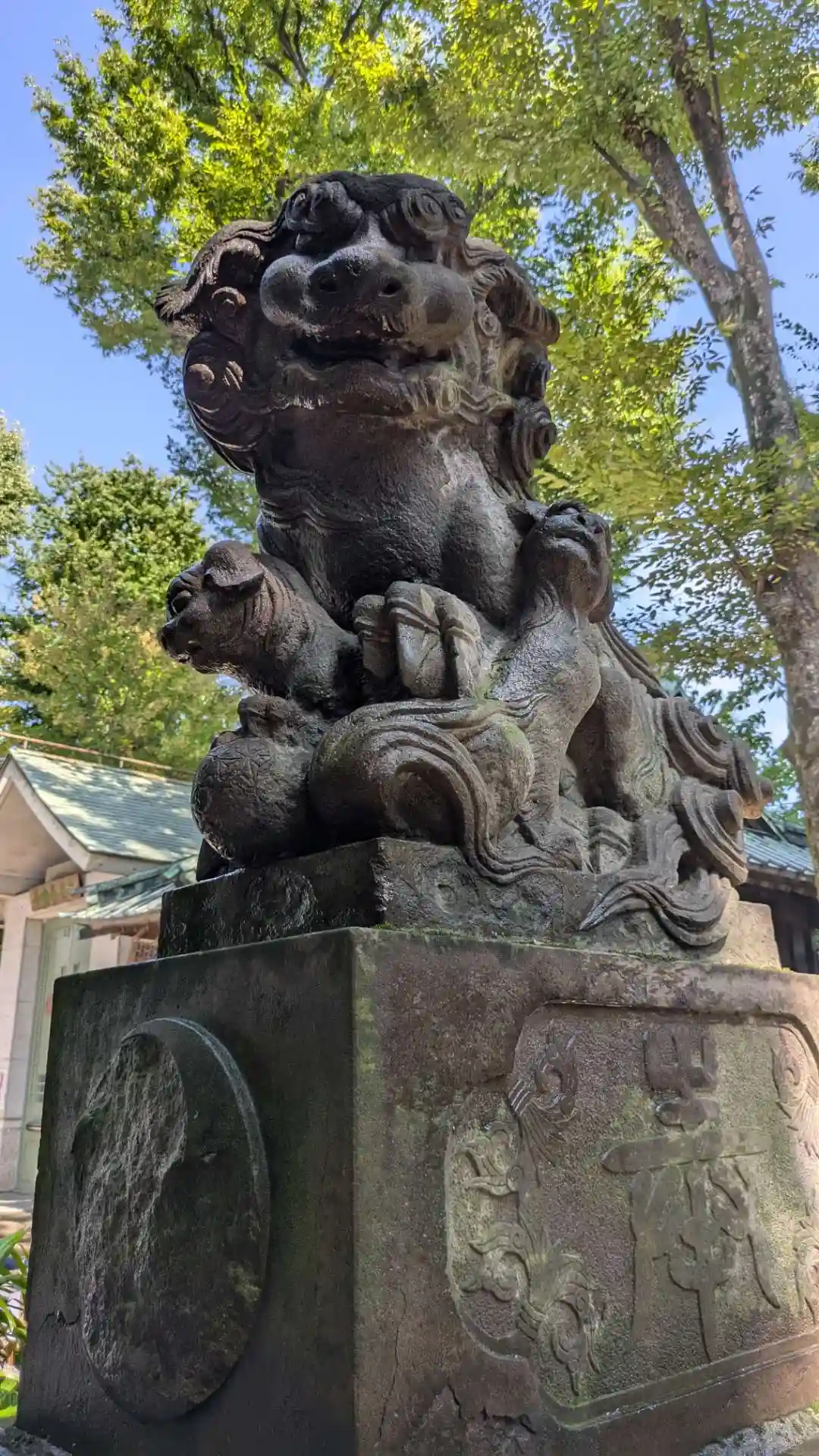南の表参道鳥居をくぐって最初の狛犬様は灯篭のレリーフです。向かって右手の狛犬様が吽の形です。
