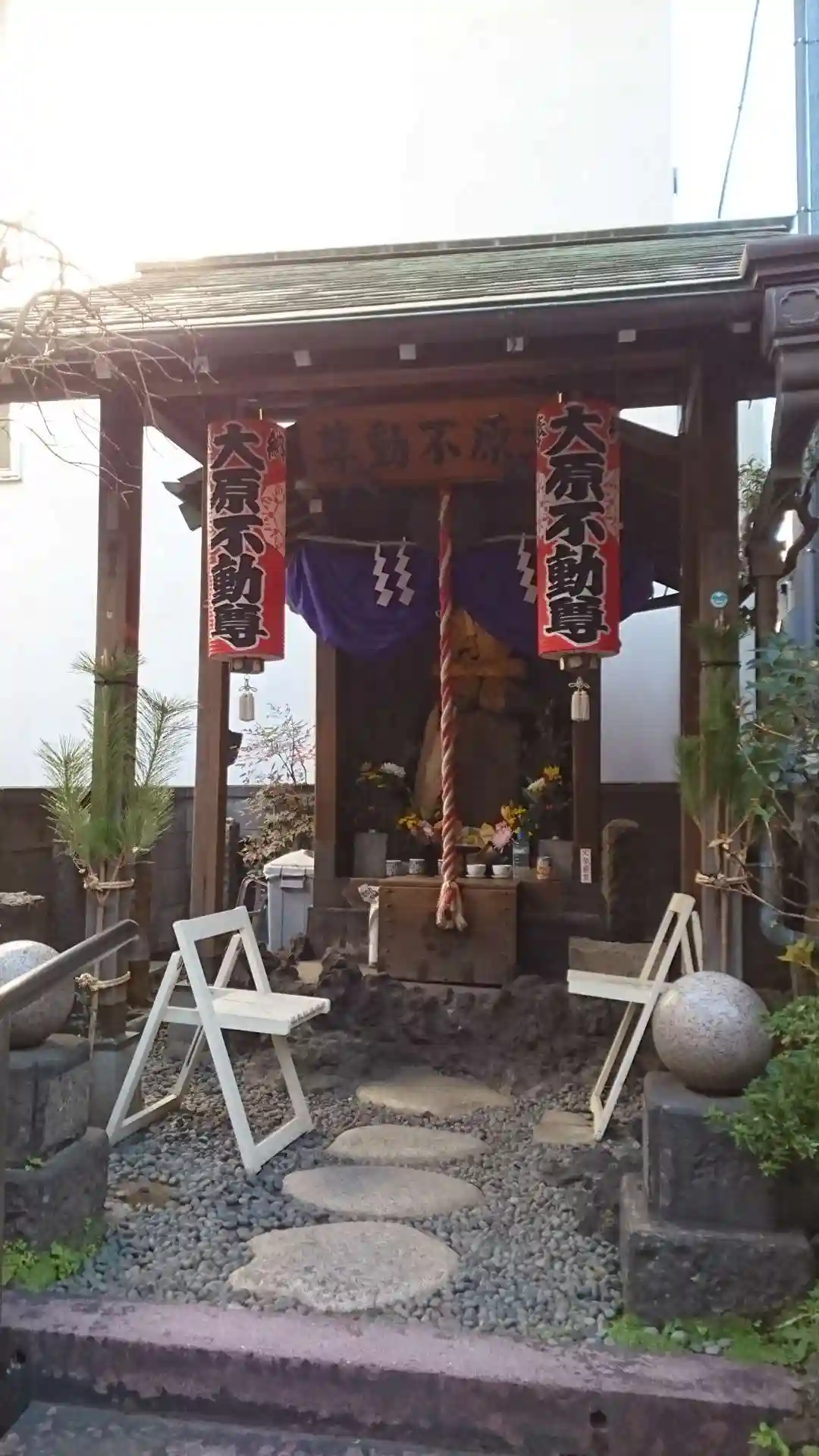 お不動様。へびくぼ市に合わせ新鮮なお花が活けてあり明るい雰囲気です。