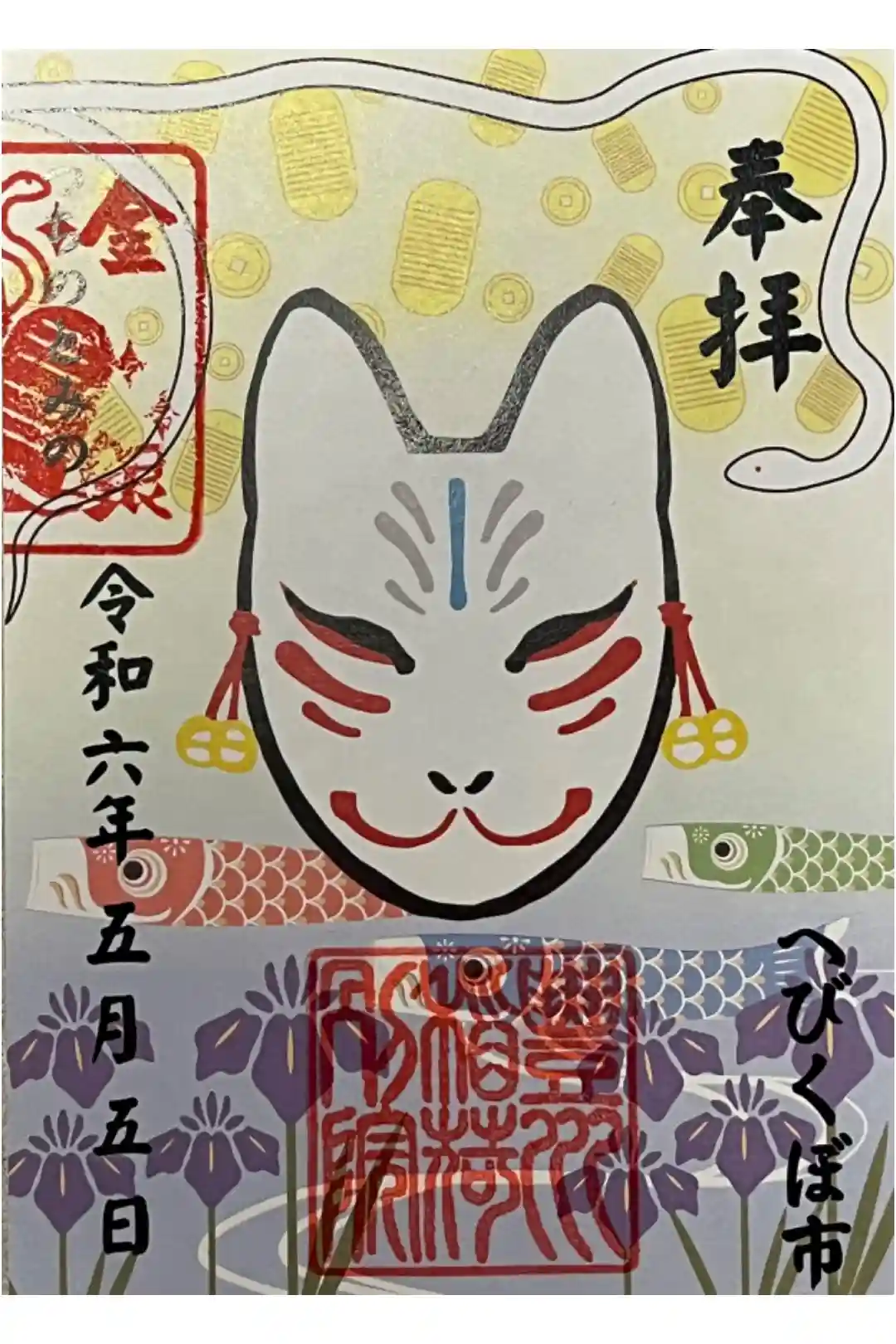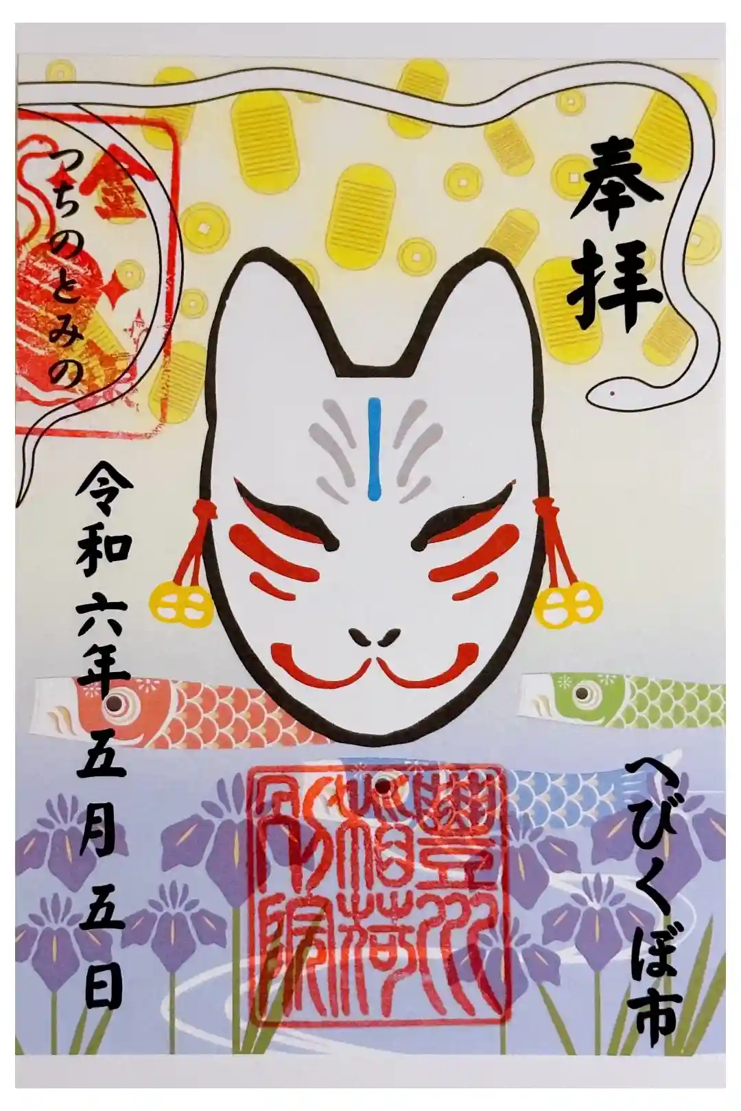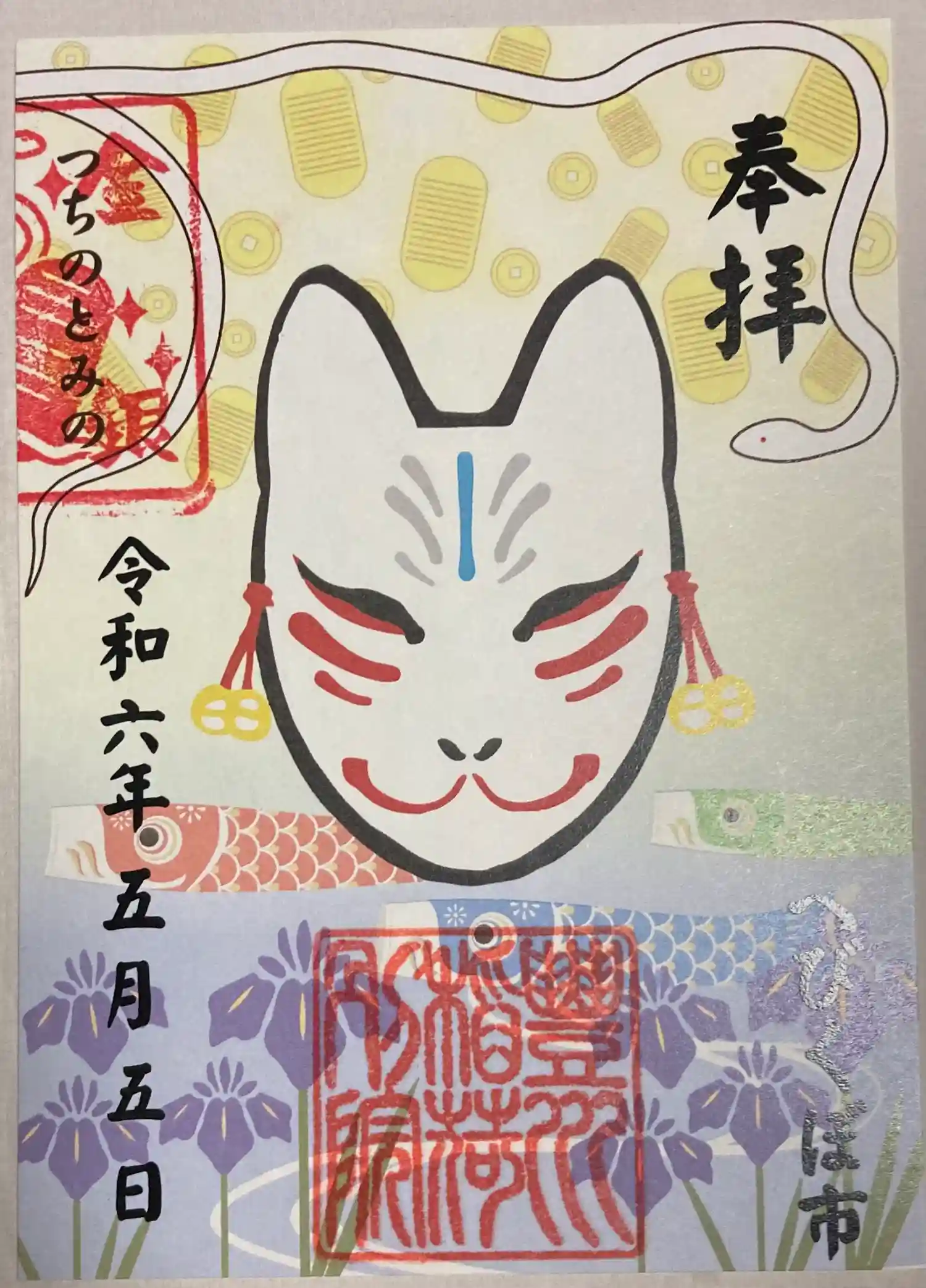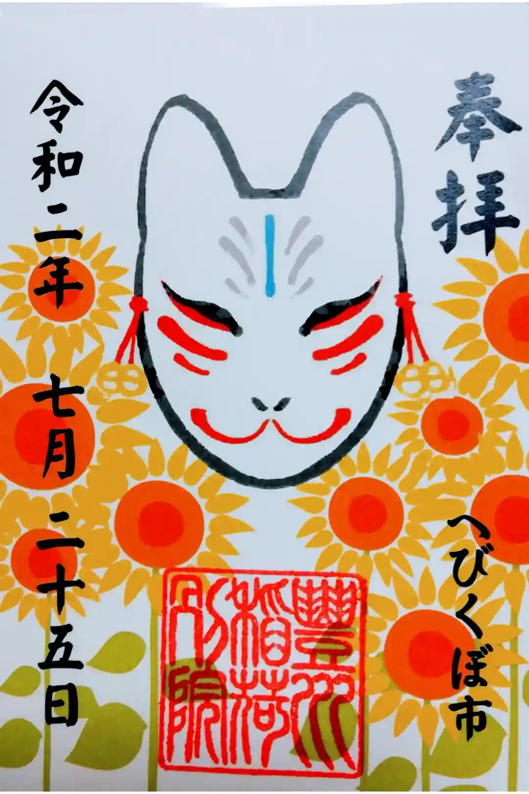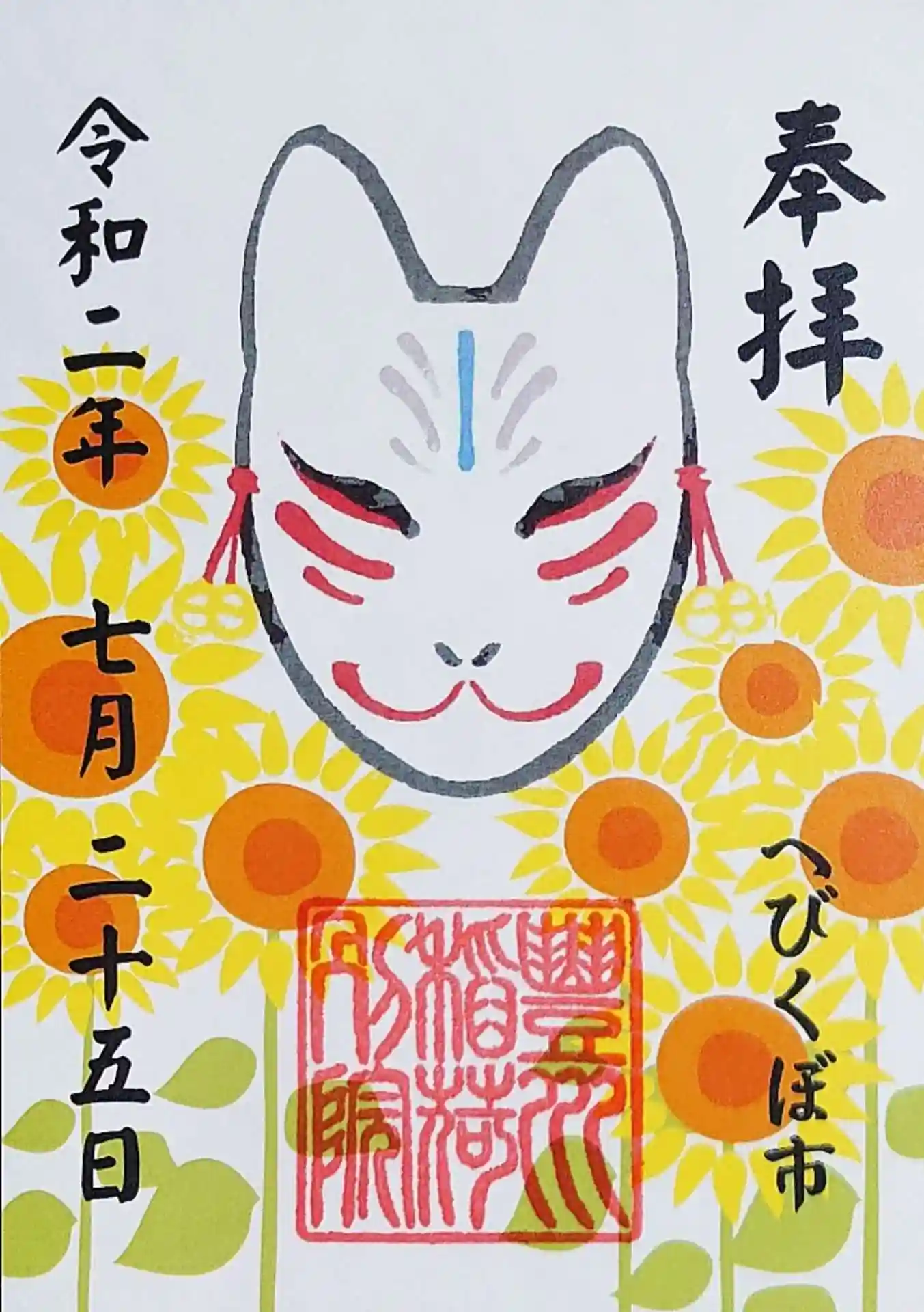蛇窪神社の己巳の日に合わせたへびくぼ市御朱印。お狐様と花のイラスト