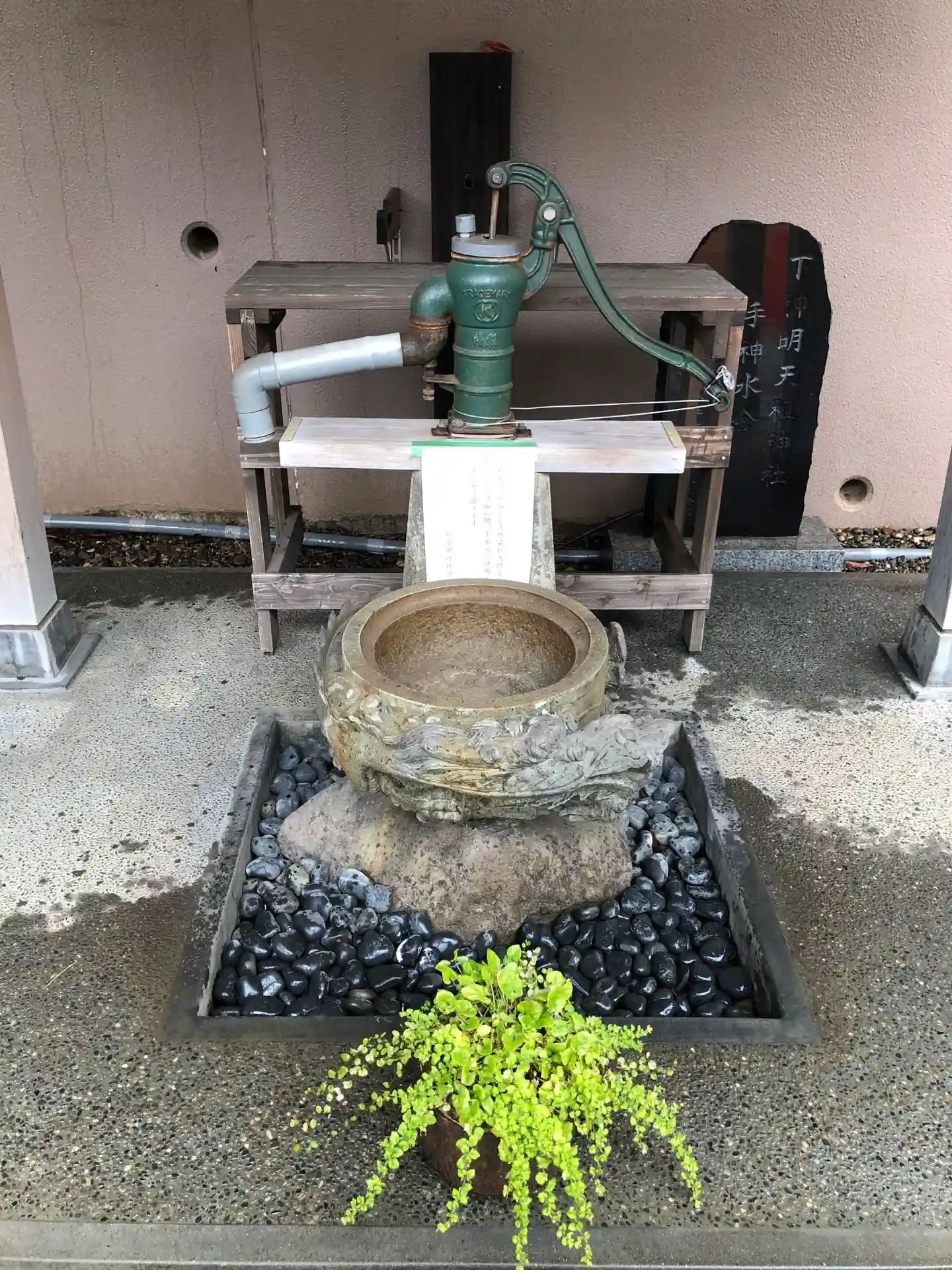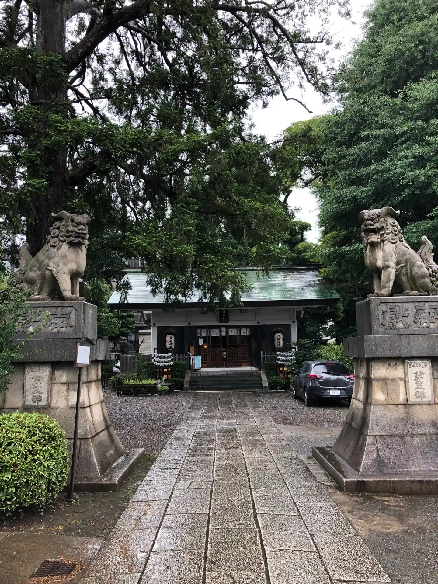 蛇窪神社から徒歩15分位、元は一つの神社だと考えられている上神明天祖神社(蛇窪神社)と下神明天祖神社、その両方に雨の中の参拝しました。手水舎がかなり変わっていまして、手水鉢に手押しポンプで水を出す仕組みのようなのですが…残念、コロナ影響により使用不可でした。社殿前には大きな狛犬さんと大きなご神木があります。なかなかの迫力です。