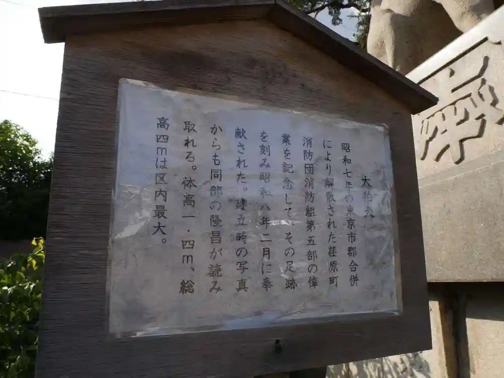 | ご由緒 | 江戸中期に編纂された幕府官撰地誌『新編武蔵風土記稿』には上下の神明社勧請の年暦は不明とある、御神木であるカヤは樹齢600年を超えており社も室町時代には在ったと想される。同風土記稿中の「正保年中改定図」に下神明の元である下蛇窪の記が始めて見られることから正保元年の前年である1643年に上下の村が分かれたとして昭和五十八年に両社で340年祭が斉行され、以降十年毎に式年大祭が行われている。当社が現御祭神を迎え神明社として鎮座したのは分立時に流布していた伊勢・八幡・春日の三神を祀る三社託宣信仰に依る。現在では区内最大の御神木、最大の狛犬、最長の参道などを有し神社を中心に雅楽の稽古が盛んに行われるなど伝統文化継承にも力を入れている。