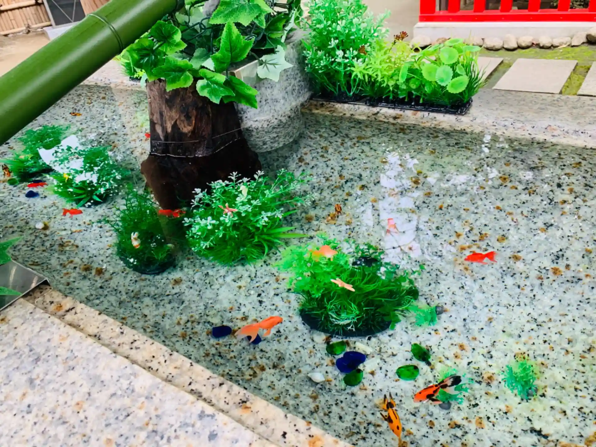金魚が泳ぐ(作り物ですが、)手水が、とても涼しげで、可愛らしく、素敵でした。