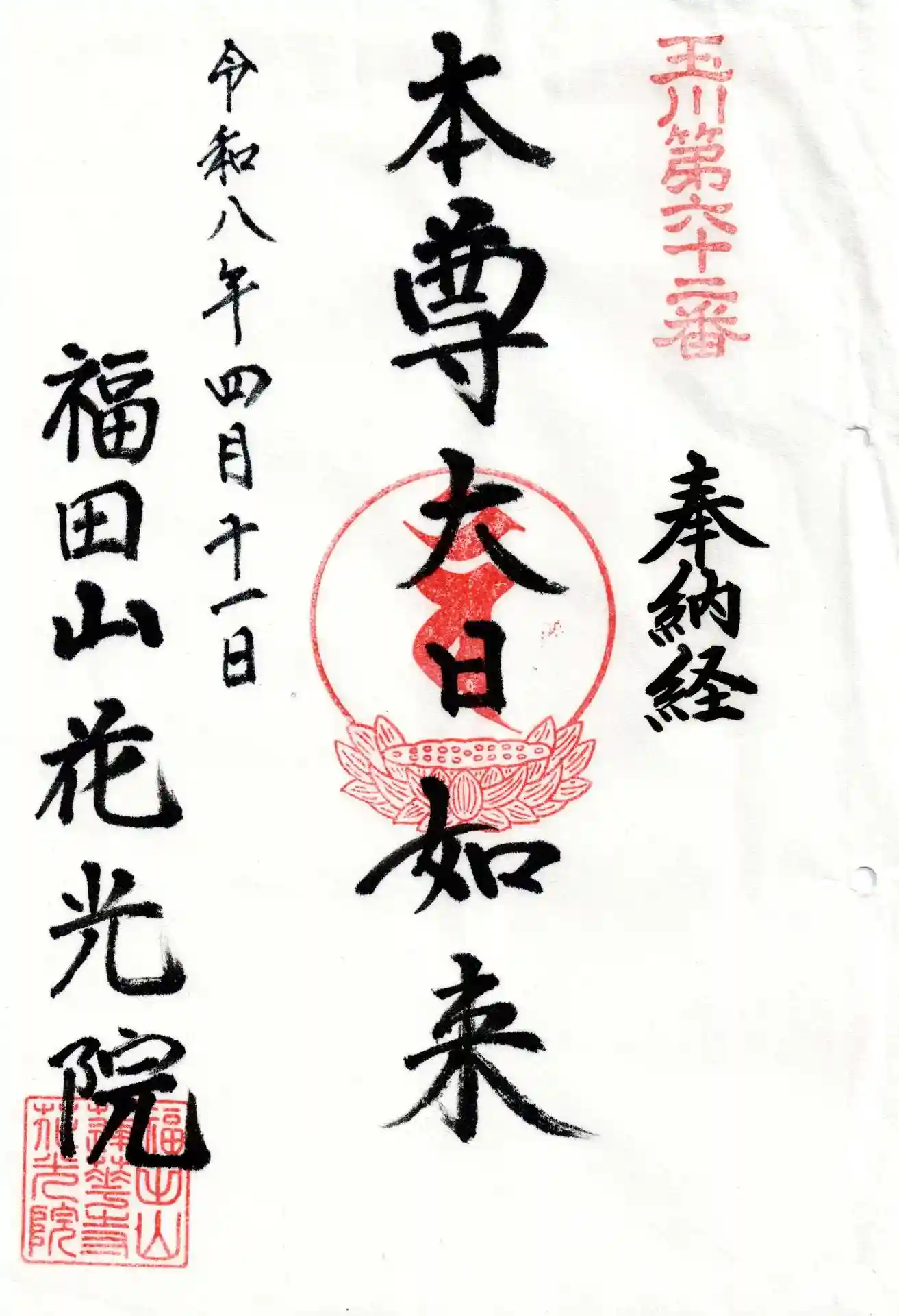 この日は4月としては珍しい夏日の暑さでしたが、お寺の方が「暑い中ようこそ」と冷たいペットボトルのお茶を差し出してくださり、その温かなお心遣いが乾いた喉と心に深く沁み渡りました。拝受した「玉川八十八ヶ所霊場」の御朱印は、半紙半分のゆったりとした大きさで、一般的な御朱印の倍はあるその堂々たる佇まいに圧倒されます。中央に力強く墨書きされた御本尊「大日如来」の文字が、広々とした紙面でいっそう輝いて見え、静かな境内でいただいたおもてなしとともに、忘れがたい参拝のひとときとなりました。