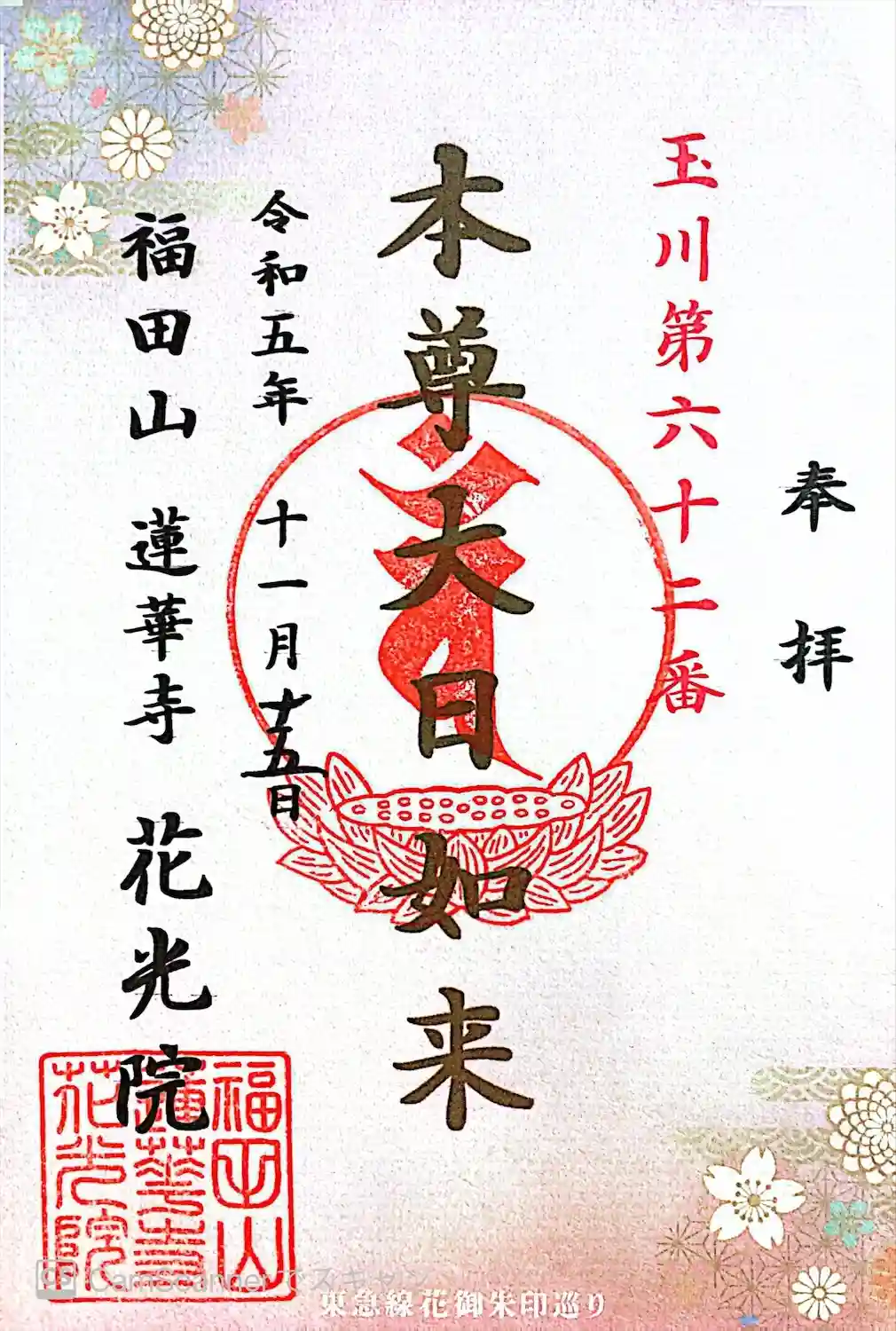 東急花御朱印2〜大田区武蔵新田にある花光院に参詣。真言宗智山派のお寺で福田山花光院蓮華寺が正式名称らしい。花光院→けこういんと読むそうです。御朱印は書置きでいただきました。また、お参りご苦労様とペットボトルのお茶をいただいた、ありがとうございます。