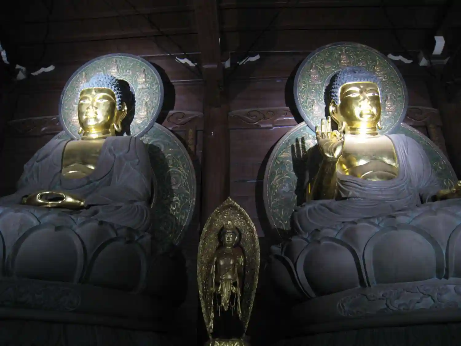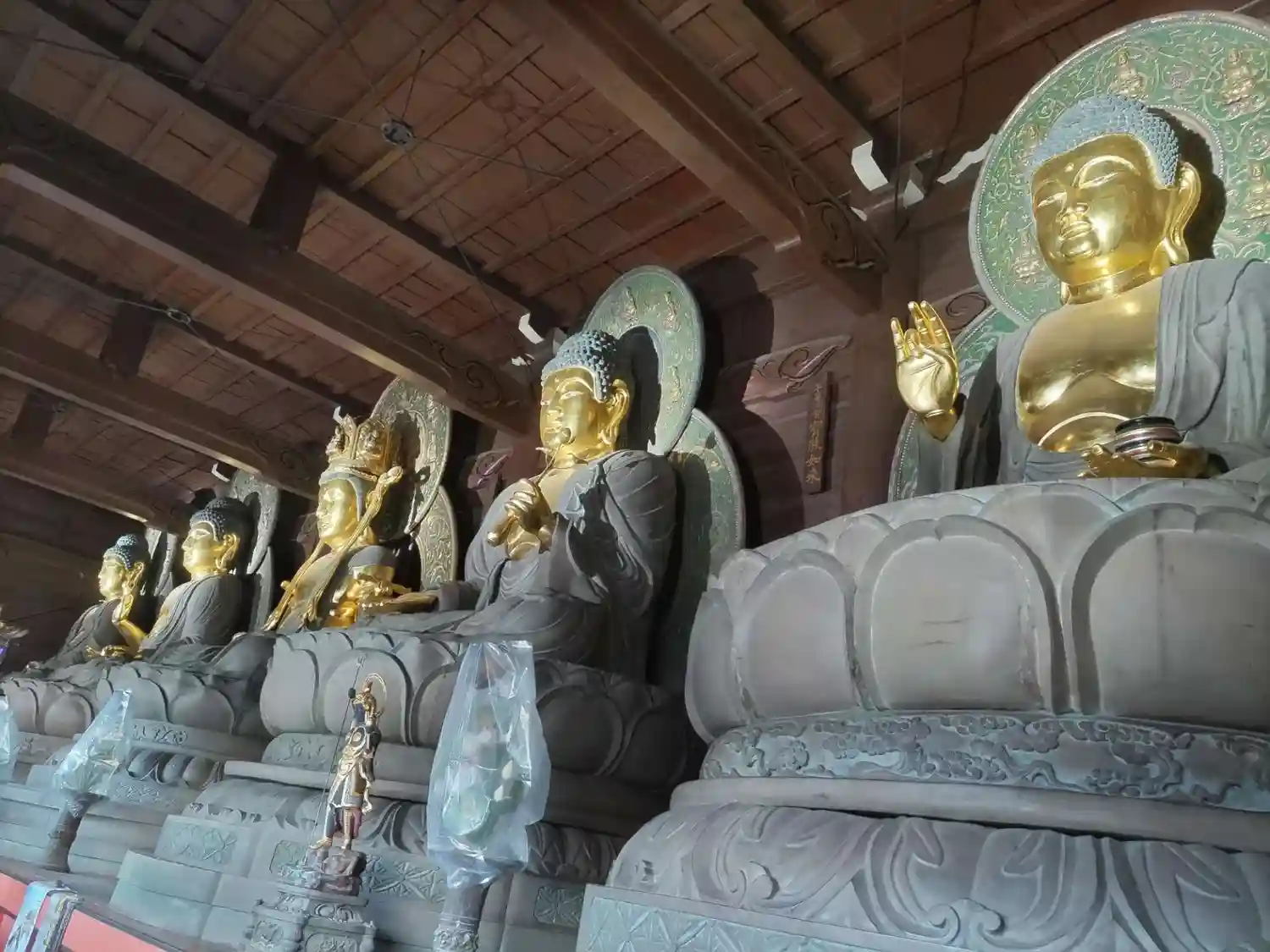 如来堂(瑞應殿)に丈六の五体の如来坐像が横一例に安置されてい…