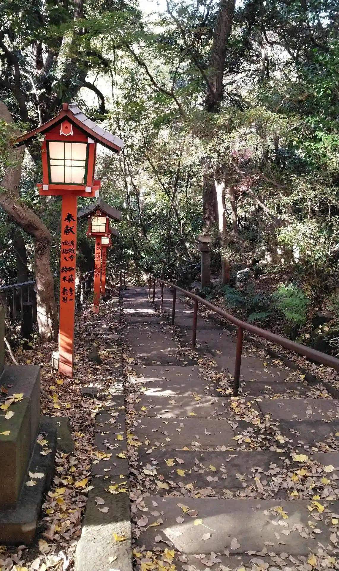 落ち葉散り敷く参道。