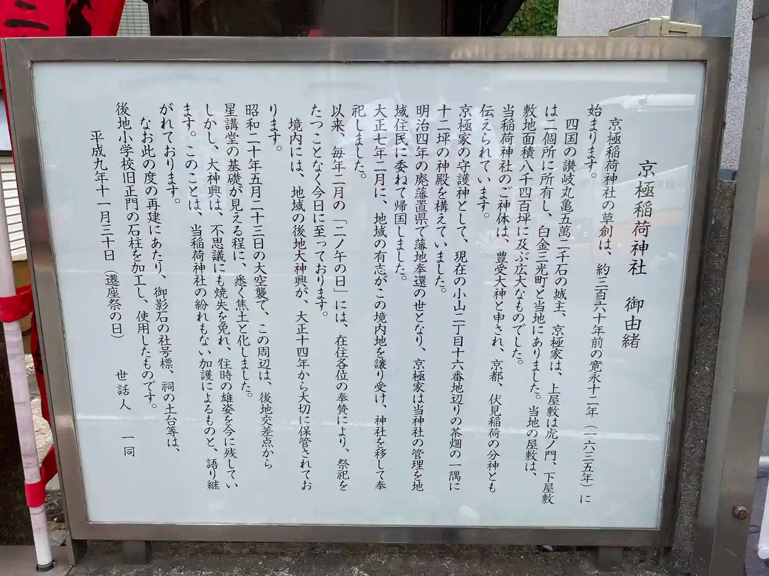 | ご由緒 | 京極稲荷神社の草創は、約三百六十年前の寛永十二年(一六三五年)に始まります。四国の讃岐丸亀五萬二千石の城主、京極家は、上屋敷は虎ノ門、下屋敷は二箇所に所有し、白金三光町と当地にありました。当地の屋敷は敷地面積八千四百坪に及ぶ広大なものでした。
