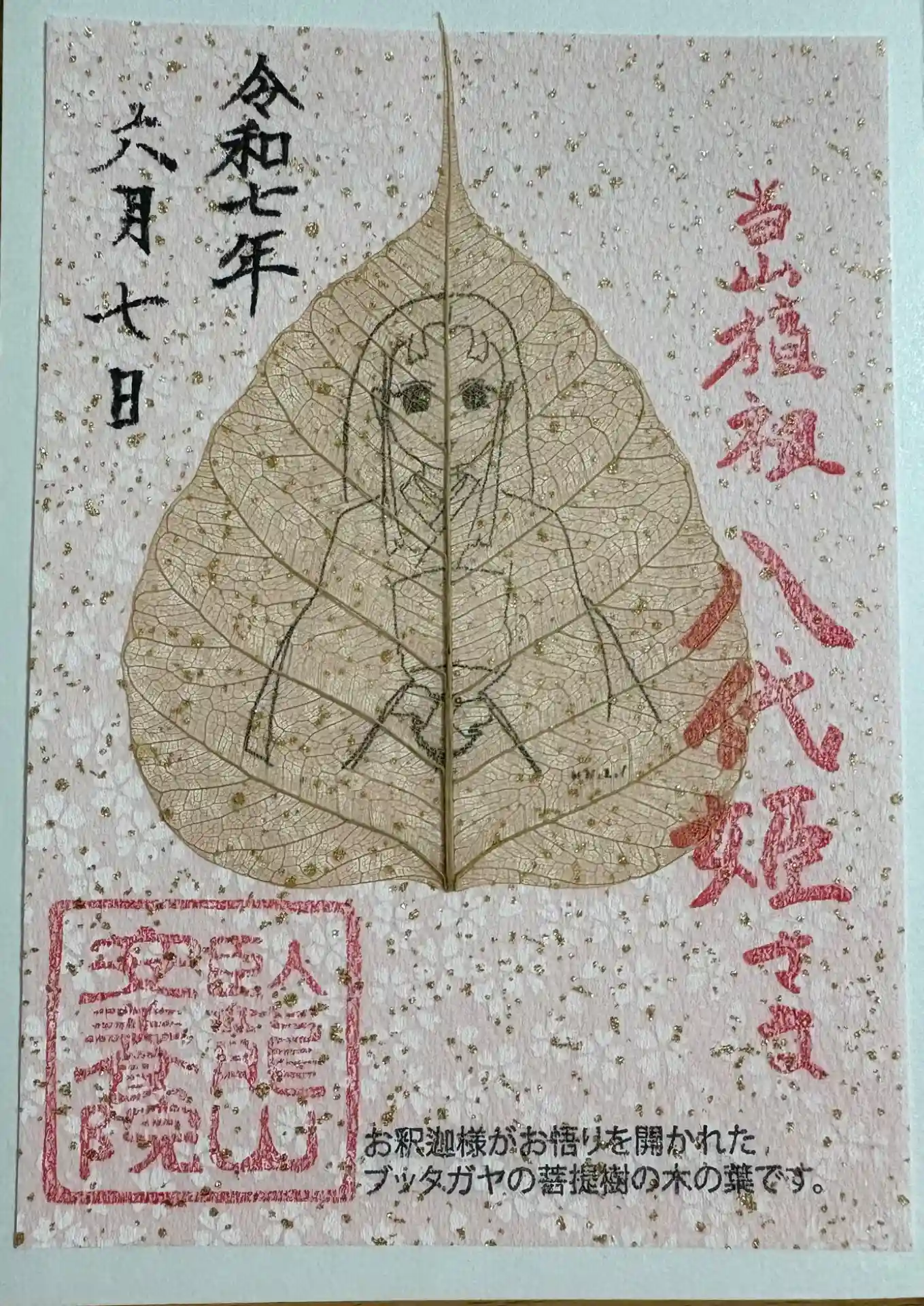 赤穂浅野家のお姫様八代姫の御朱印。檀祖とのこと。ブッダガヤの菩提樹の葉が押し花されています。