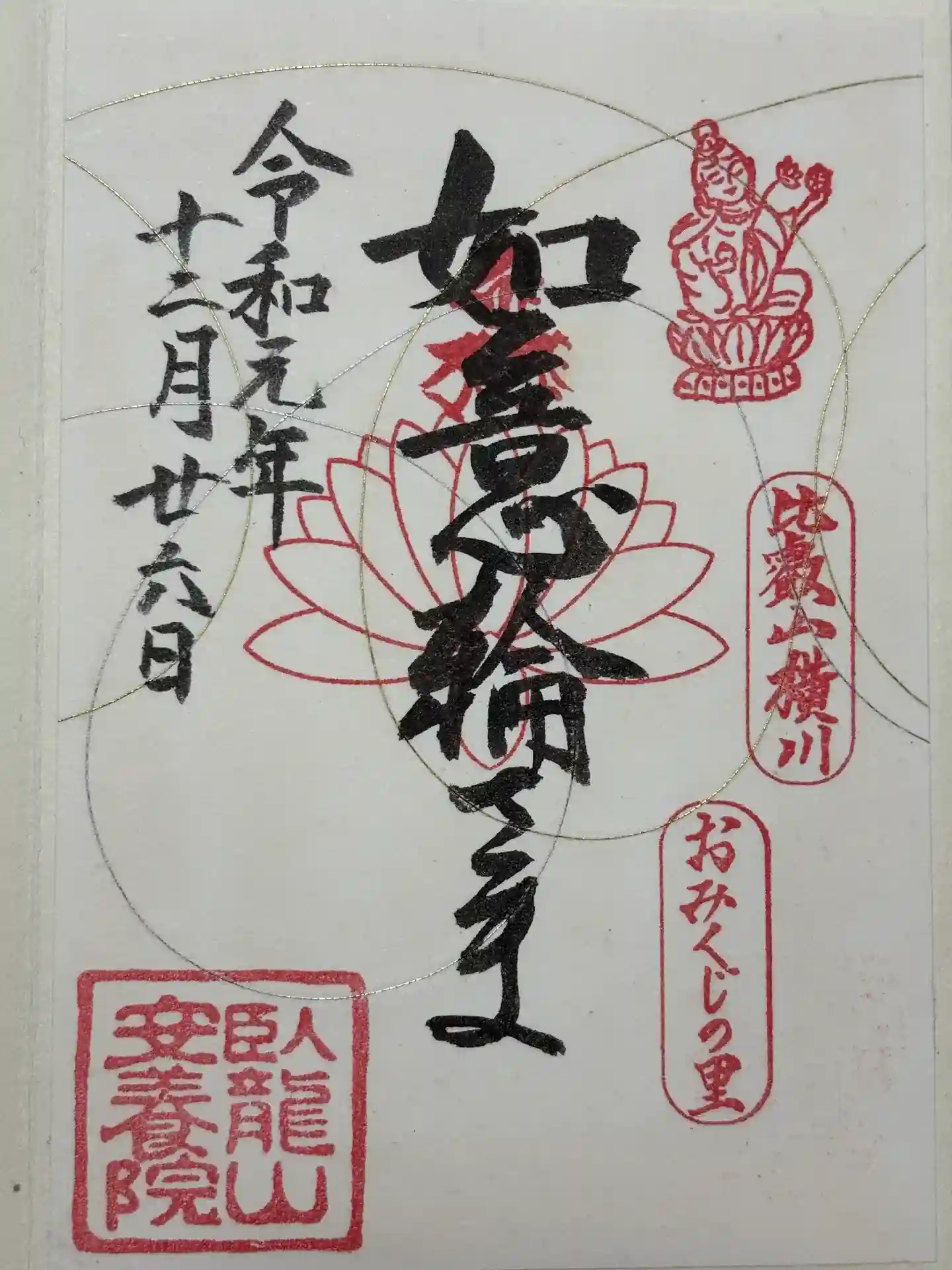 如意輪さま御朱印。如意輪観音の絵。比叡山横川おみくじの里。立体的な金銀の浮き彫り糸が施されている和紙で、実物の美しさは写真では再現できません。