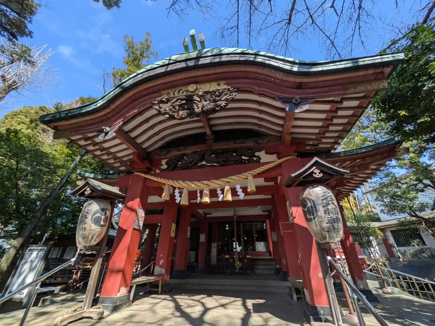境内は、氏子崇敬者の御霊を祀る斎霊殿、末社八社をはじめ、大田区文化財指定庚申供養塔群、不世出の大横綱大鵬関奉納の出世石を有する鎮守の杜に囲まれ、四季折々参拝者の憩いの場として親しまれている。