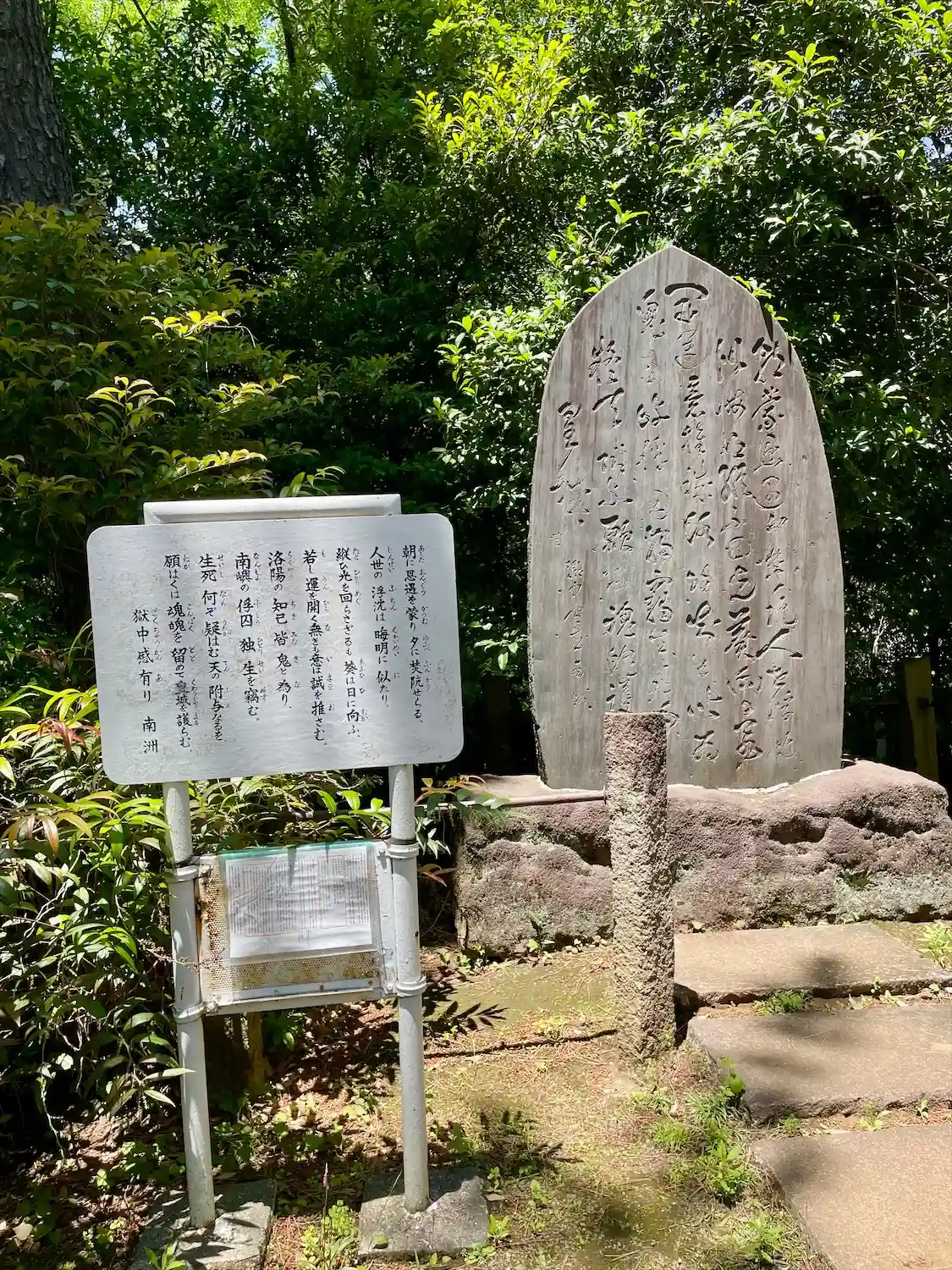 留魂祠に先立ち、西郷隆盛の漢詩碑を建碑、双方ともに四ツ木薬妙寺境内に造立したものの、勝海舟没後の大正2年、勝海舟の遺言により勝海舟夫妻の墓の隣地に移転した。
