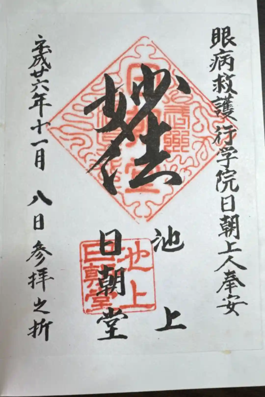 池上本門寺の境内にあります。12日からの御会式の準備中のため、御主題は書き置きをいただきました。眼…