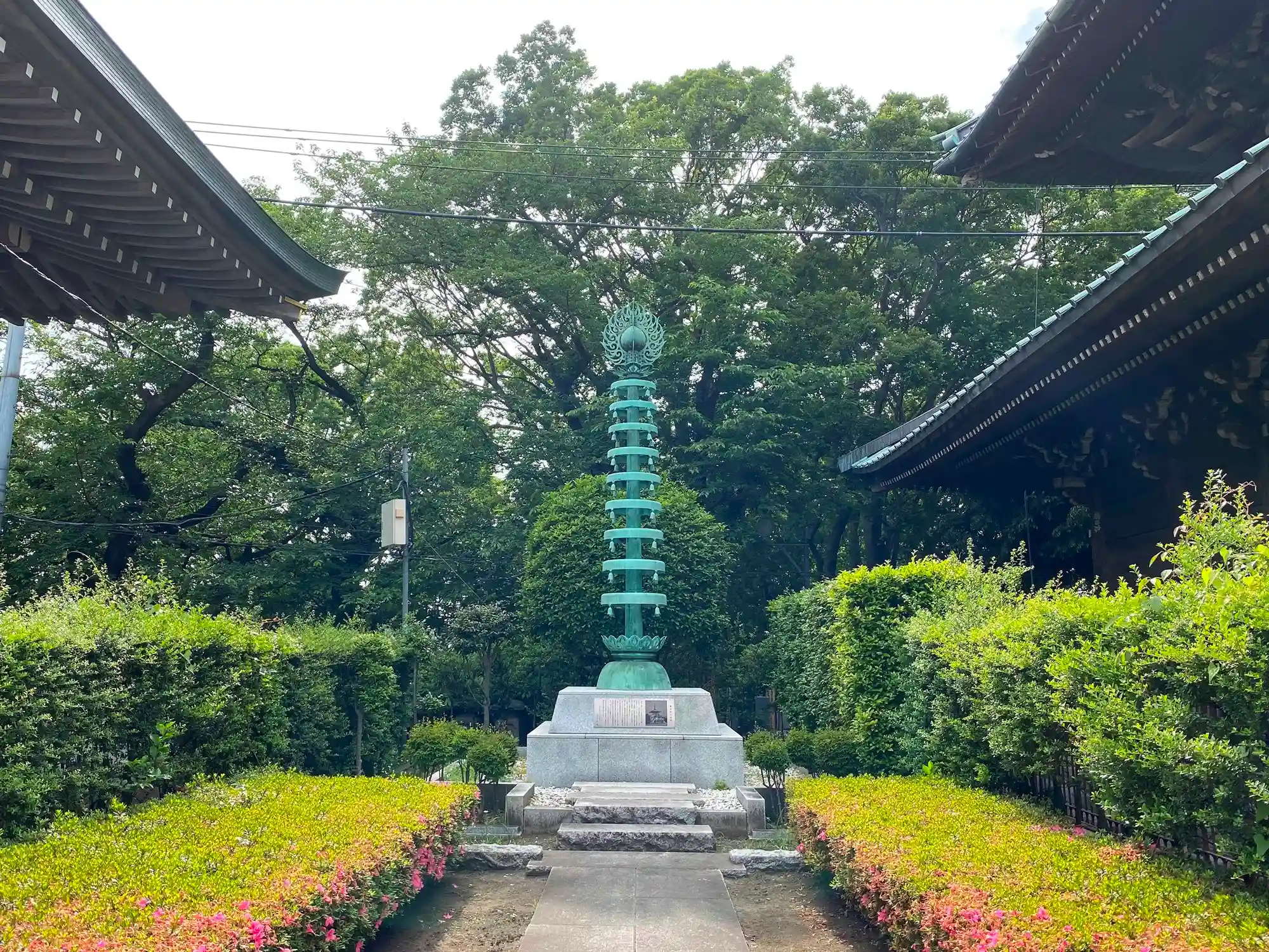 経蔵の右側、霊宝殿との間にある<旧奉安塔の相輪>。1945年の米軍空襲以降、伽藍再建完了までの間、日蓮聖人像と御真骨を格護した奉安塔(現在は解体済み)の相輪部分。
