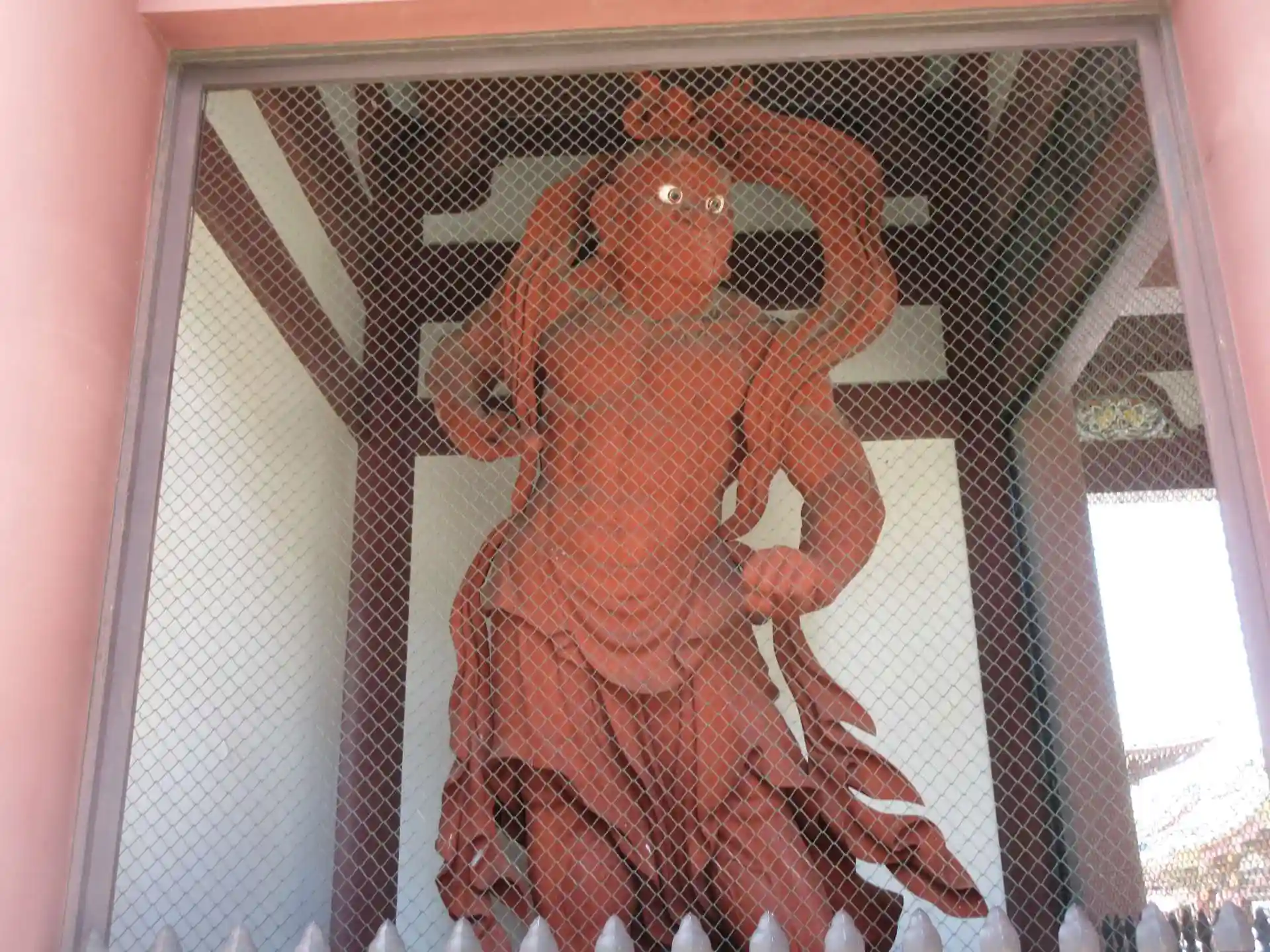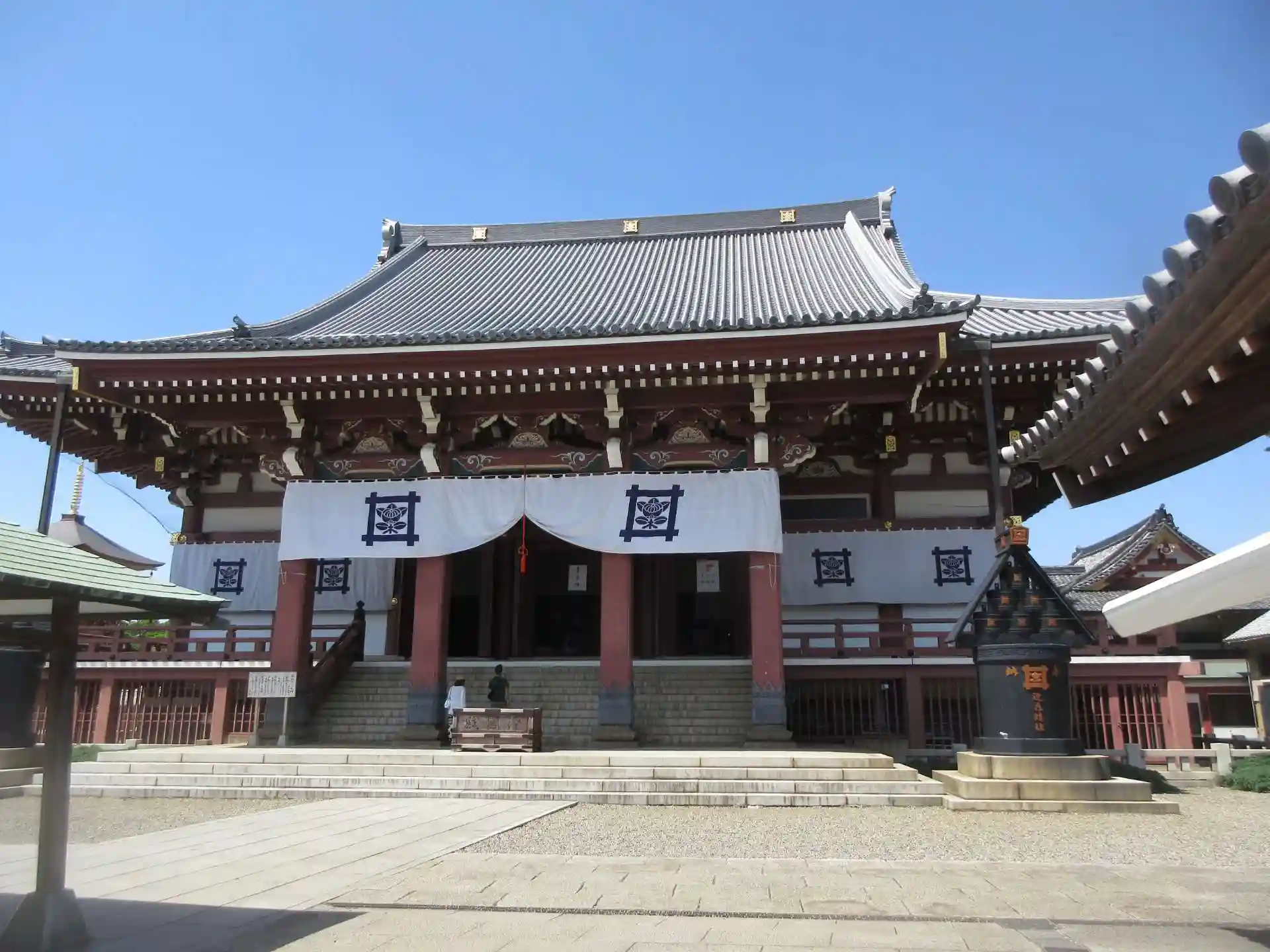 参拝者があまりいないので本堂前がとても広く感じられる。本堂に入ると南無妙法蓮華経の声が朗々と聞こえてくる。ちょうど祈祷をしているところか。日蓮聖人の像も見える。