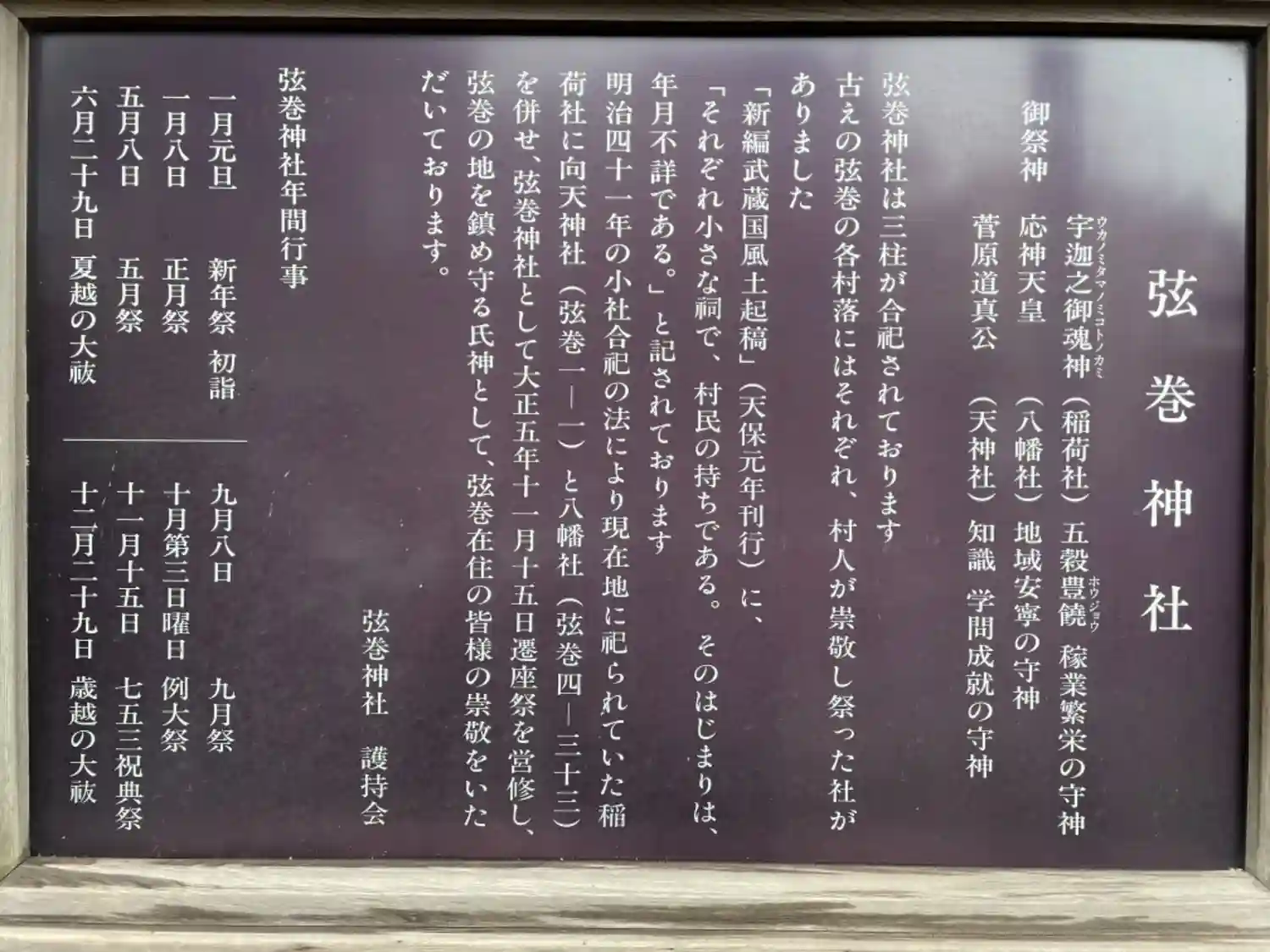 | ご祭神 | 《合》菅原道真,《主》応神天皇,宇迦能御魂神 | |