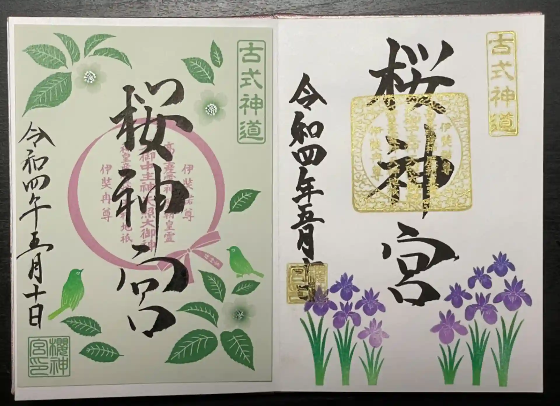 5月の御朱印(あやめ・直書き可/葉桜とメジロ・書き置き)