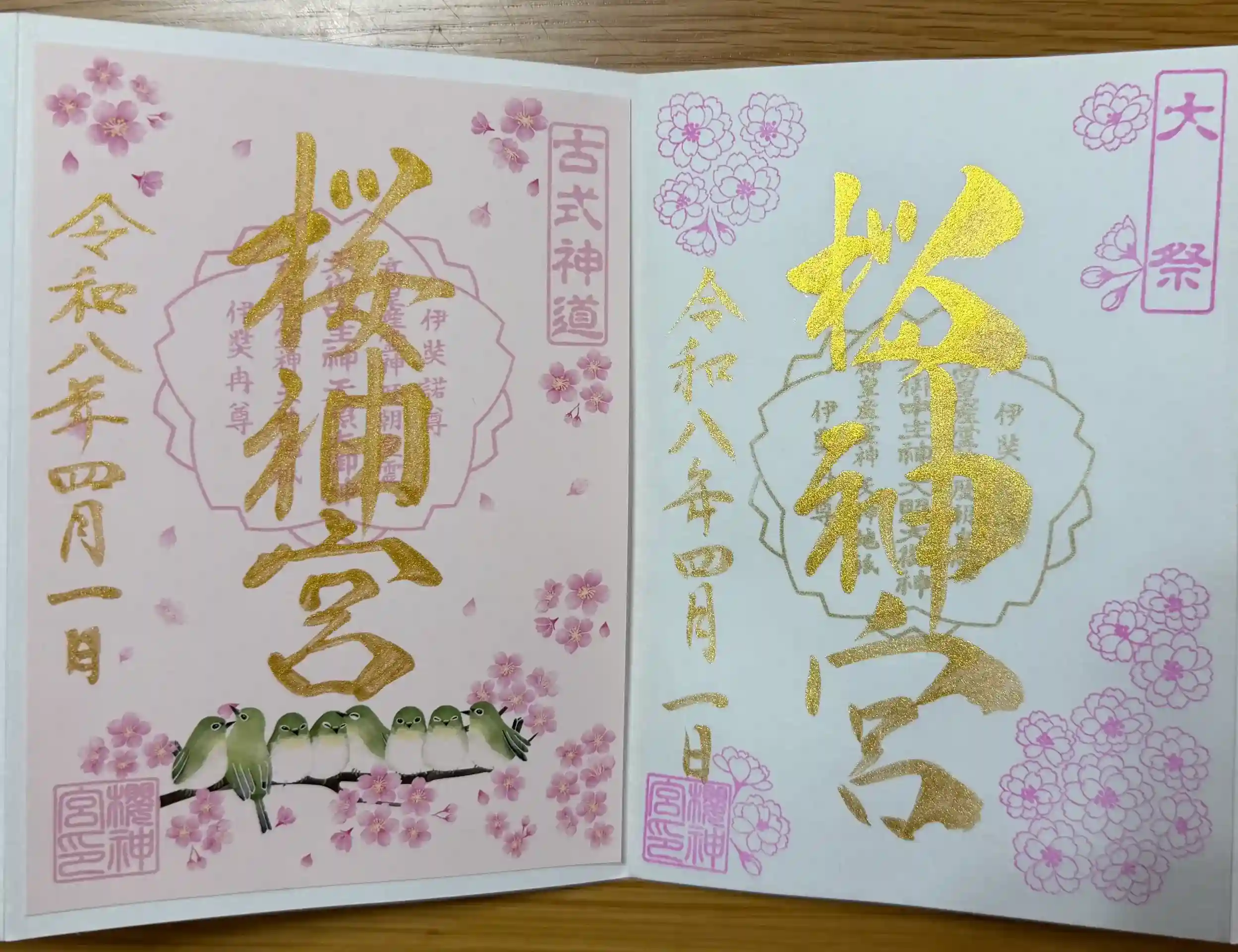 御朱印は期間限定の八重桜(直書き)とメジロ(書き置き)をいただきました。