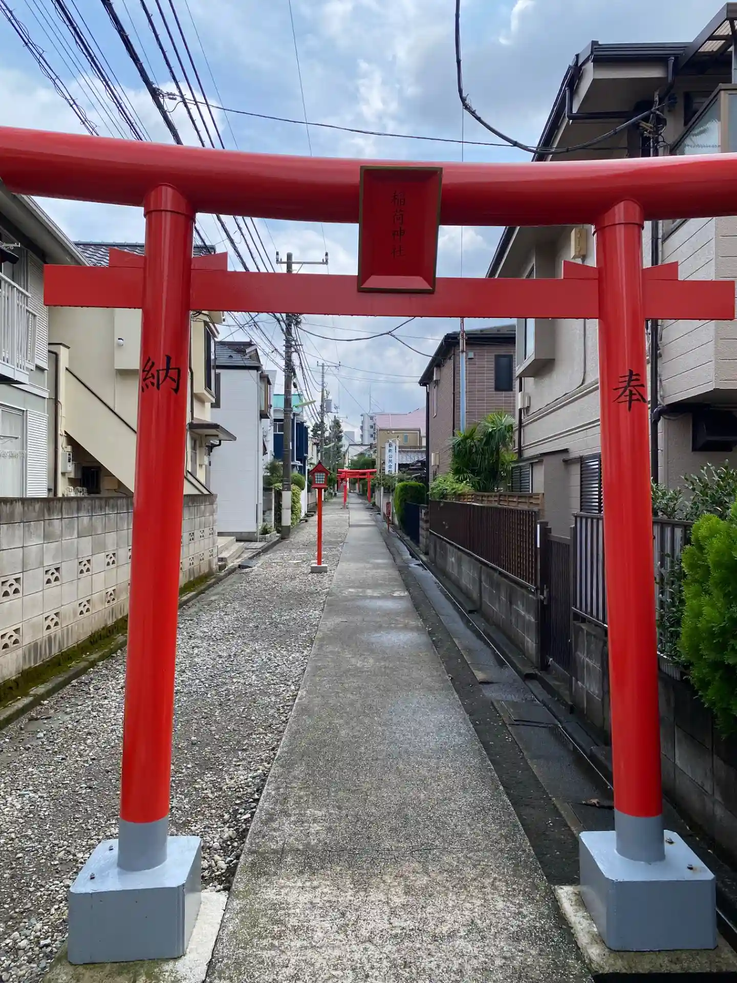 住宅の間の長い参道の先の神社です