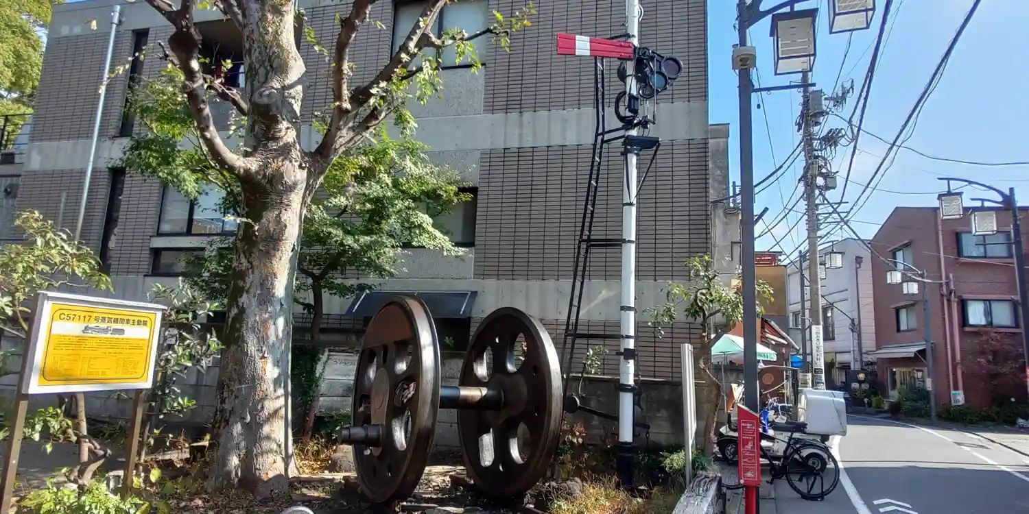 駅からの通りすがりに見かけたSLの動輪と信号機。なぜここにあるのか謎。