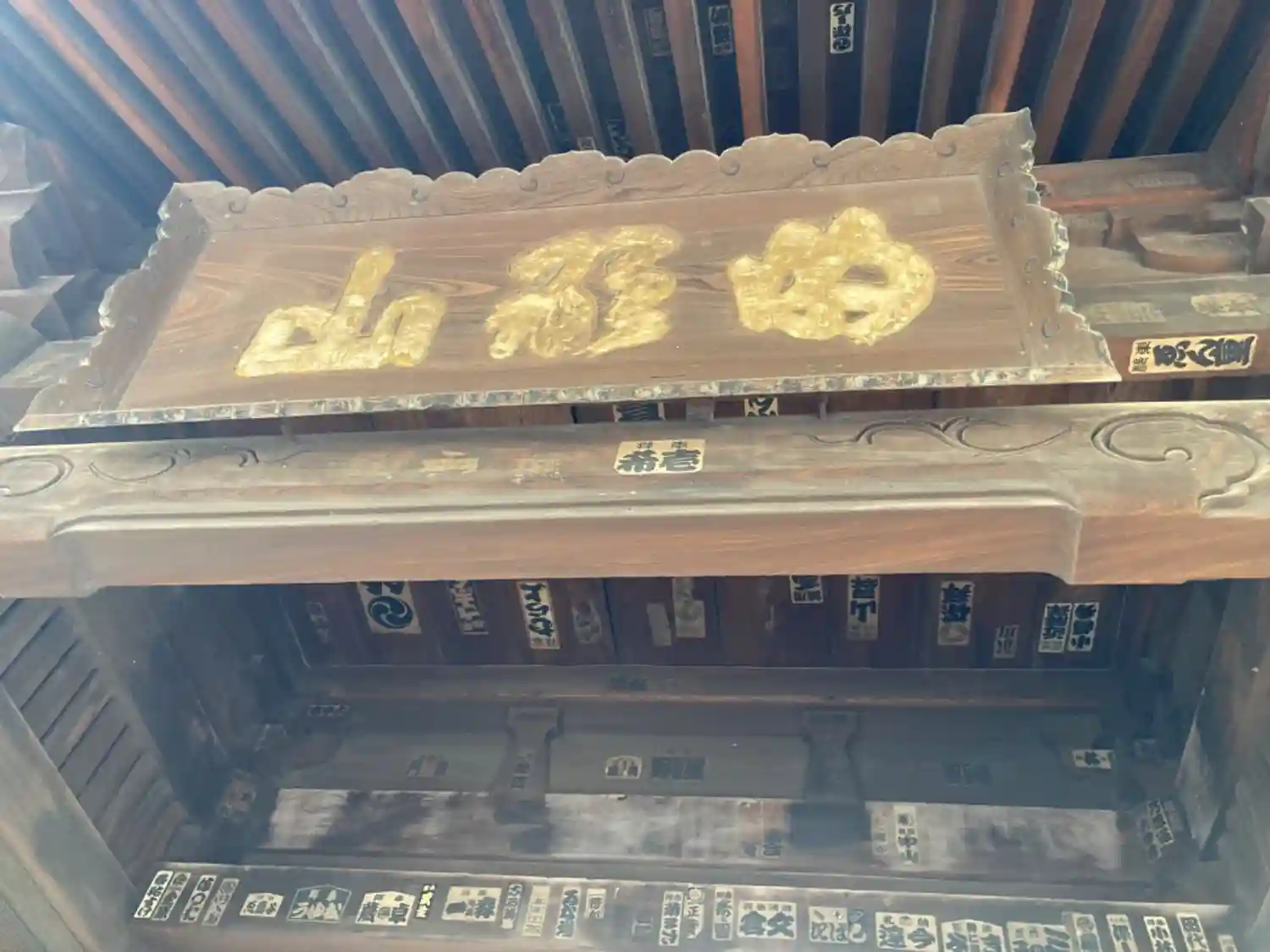 本堂の賽銭箱の飾りは、火消しの纏の目印のようです